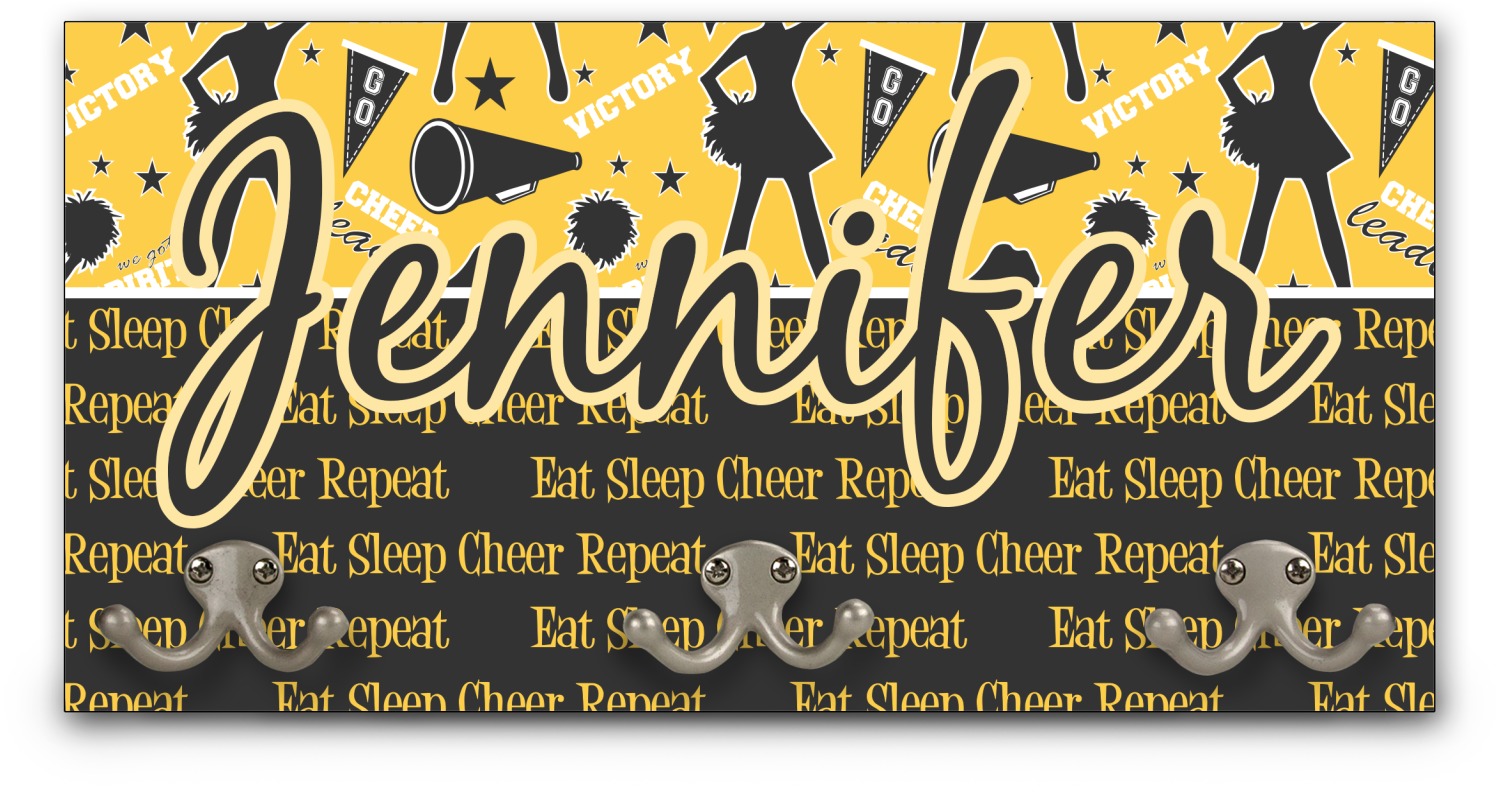This design is a fun combo with a bright yellow and black. The two colors are a great contrast to one another. The top half of the design has a cheerleader sillhouette as well as words like "cheerleader" and "victory." The bottom half has a background that says eat, sleep, cheer, repeat. Your personalization goes right in between these two backgrounds right in the middle.