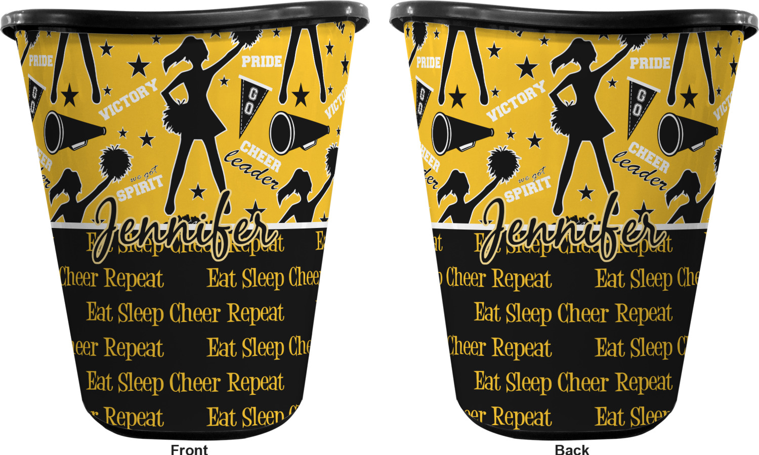 This design is a fun combo with a bright yellow and black. The two colors are a great contrast to one another. The top half of the design has a cheerleader sillhouette as well as words like "cheerleader" and "victory." The bottom half has a background that says eat, sleep, cheer, repeat. Your personalization goes right in between these two backgrounds right in the middle.