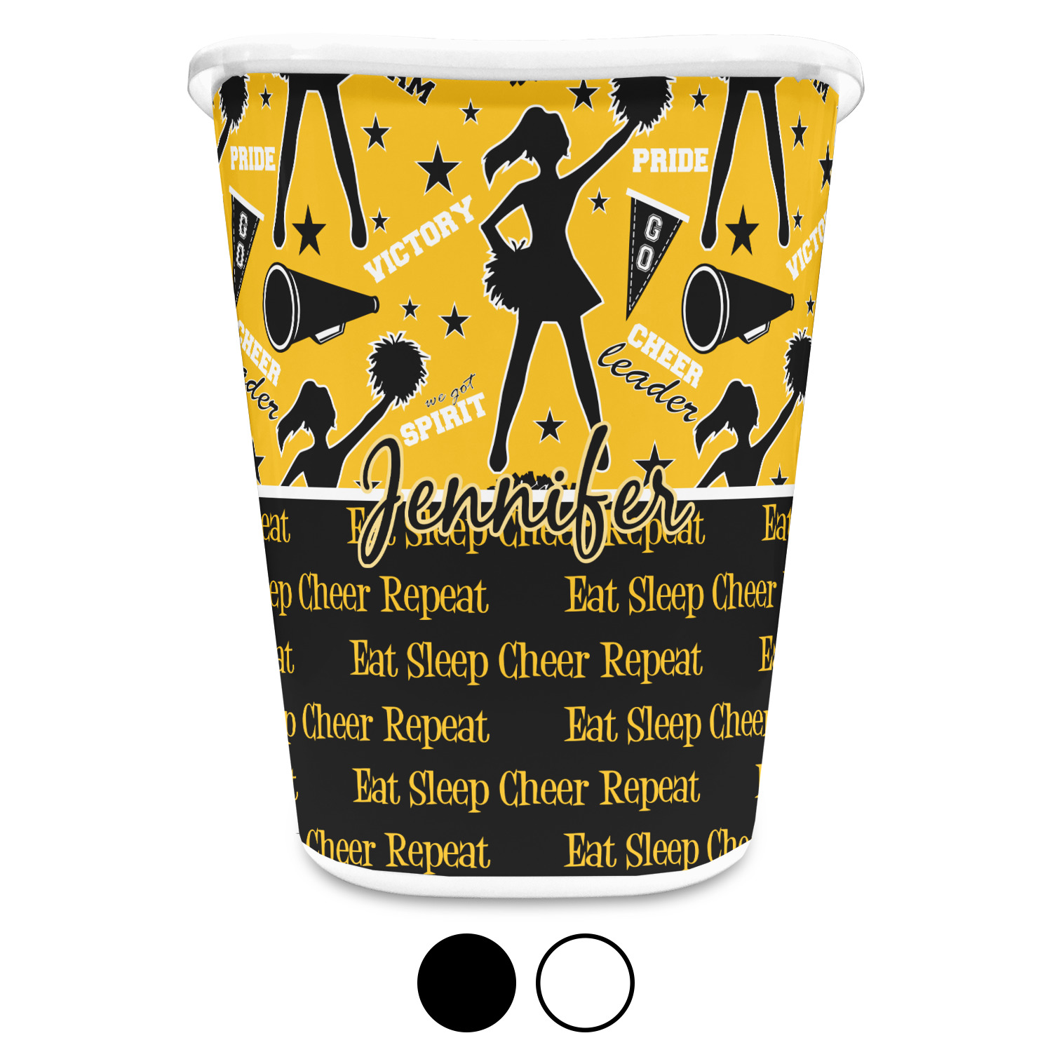 This design is a fun combo with a bright yellow and black. The two colors are a great contrast to one another. The top half of the design has a cheerleader sillhouette as well as words like "cheerleader" and "victory." The bottom half has a background that says eat, sleep, cheer, repeat. Your personalization goes right in between these two backgrounds right in the middle.