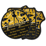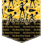 This design is a fun combo with a bright yellow and black. The two colors are a great contrast to one another. The top half of the design has a cheerleader sillhouette as well as words like "cheerleader" and "victory." The bottom half has a background that says eat, sleep, cheer, repeat. Your personalization goes right in between these two backgrounds right in the middle.