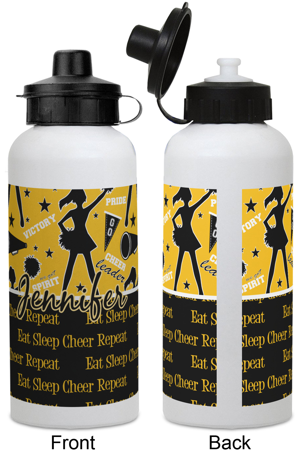 This design is a fun combo with a bright yellow and black. The two colors are a great contrast to one another. The top half of the design has a cheerleader sillhouette as well as words like "cheerleader" and "victory." The bottom half has a background that says eat, sleep, cheer, repeat. Your personalization goes right in between these two backgrounds right in the middle.