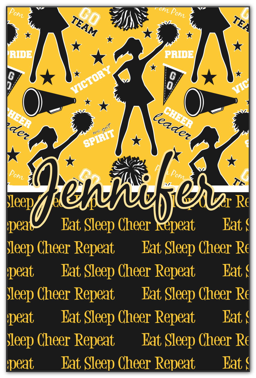 This design is a fun combo with a bright yellow and black. The two colors are a great contrast to one another. The top half of the design has a cheerleader sillhouette as well as words like "cheerleader" and "victory." The bottom half has a background that says eat, sleep, cheer, repeat. Your personalization goes right in between these two backgrounds right in the middle.