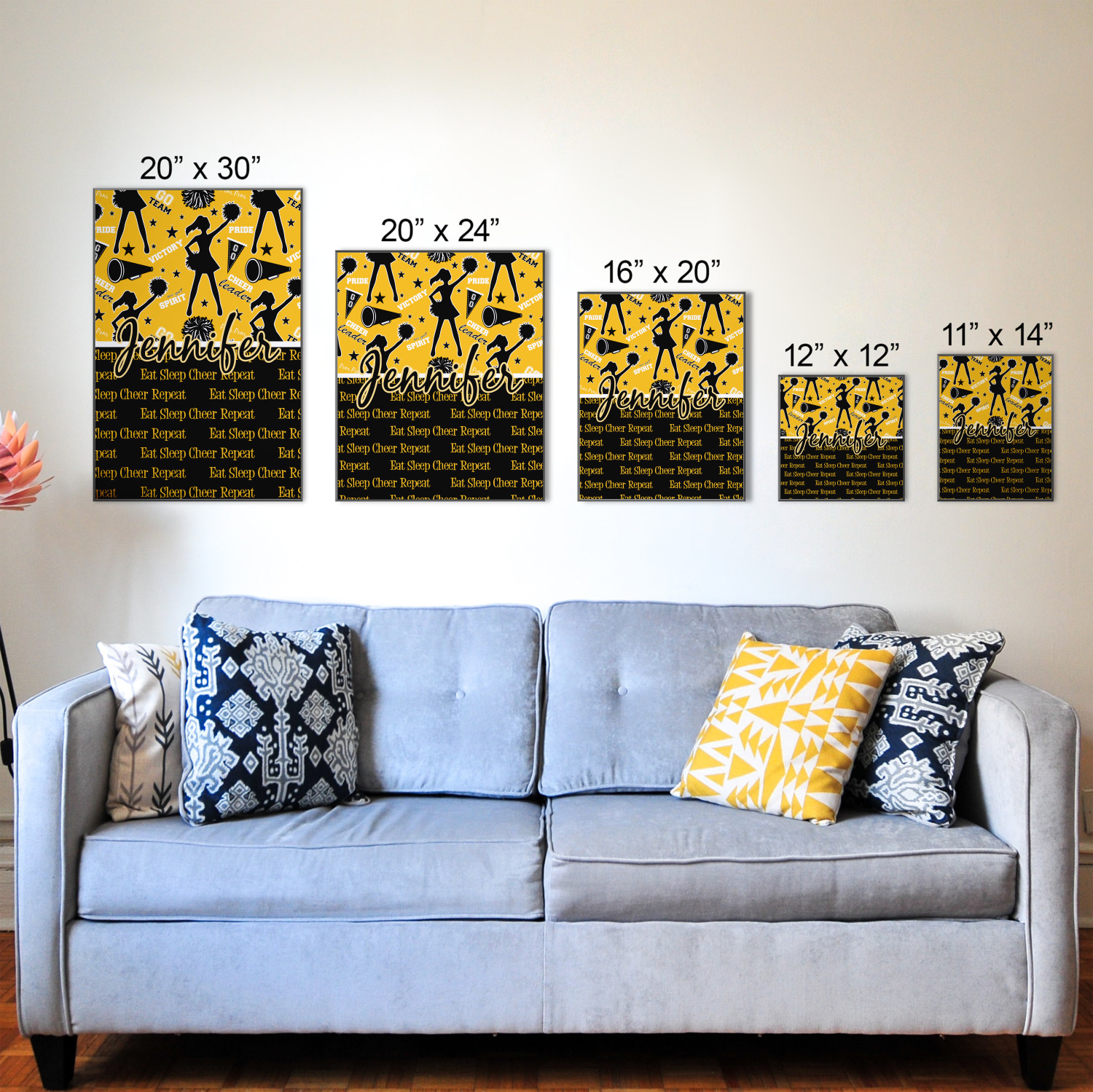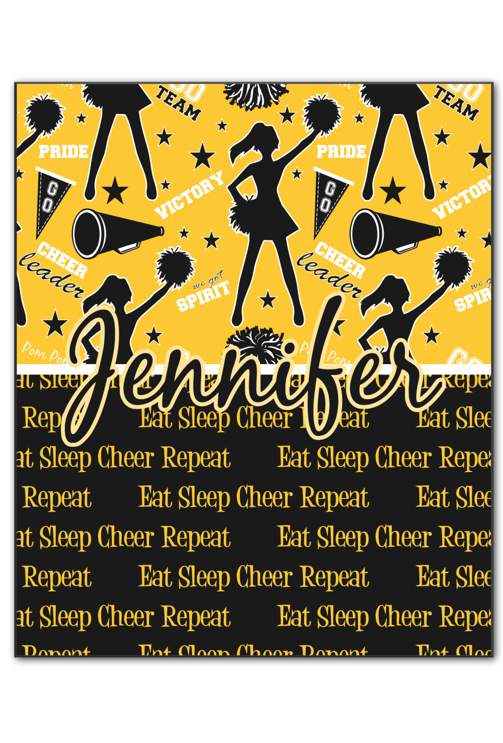 This design is a fun combo with a bright yellow and black. The two colors are a great contrast to one another. The top half of the design has a cheerleader sillhouette as well as words like "cheerleader" and "victory." The bottom half has a background that says eat, sleep, cheer, repeat. Your personalization goes right in between these two backgrounds right in the middle.