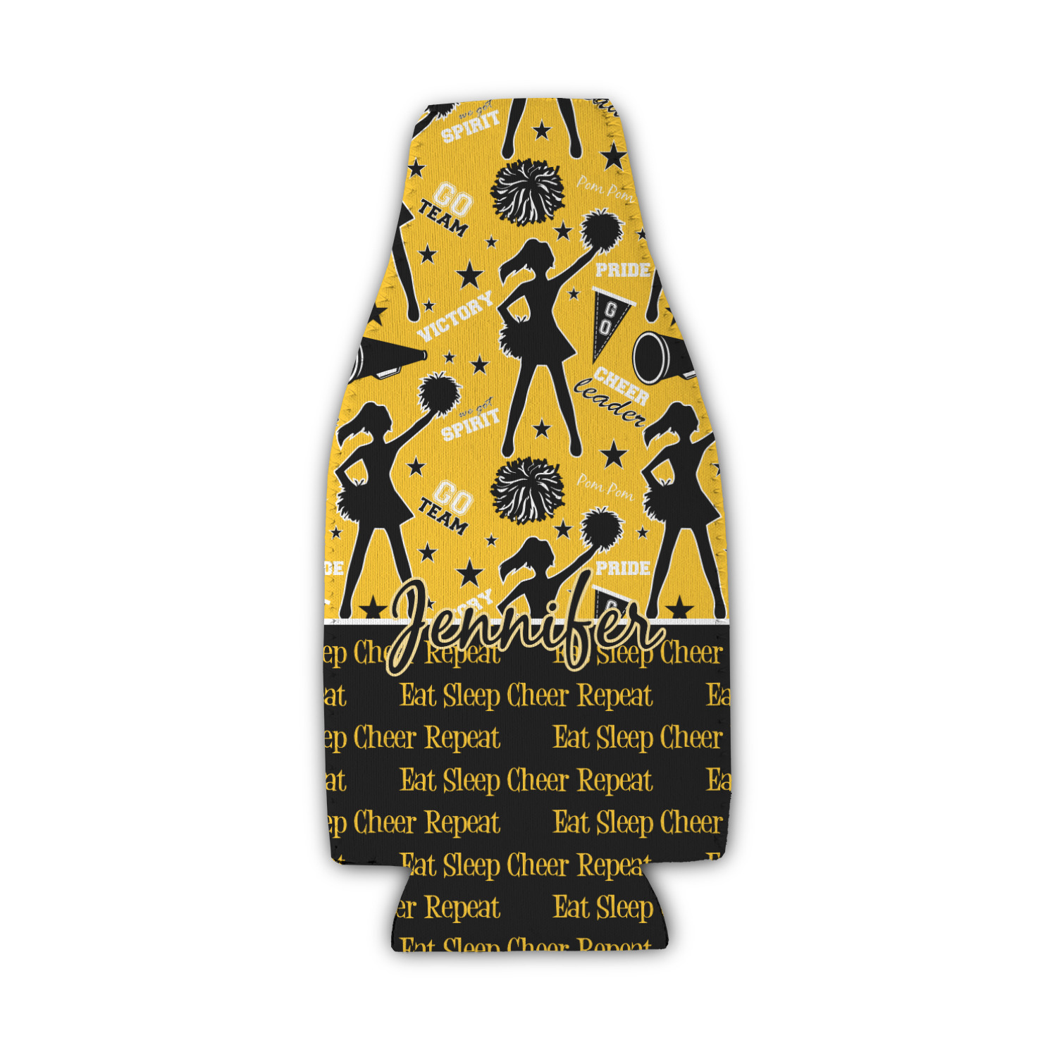 This design is a fun combo with a bright yellow and black. The two colors are a great contrast to one another. The top half of the design has a cheerleader sillhouette as well as words like "cheerleader" and "victory." The bottom half has a background that says eat, sleep, cheer, repeat. Your personalization goes right in between these two backgrounds right in the middle.