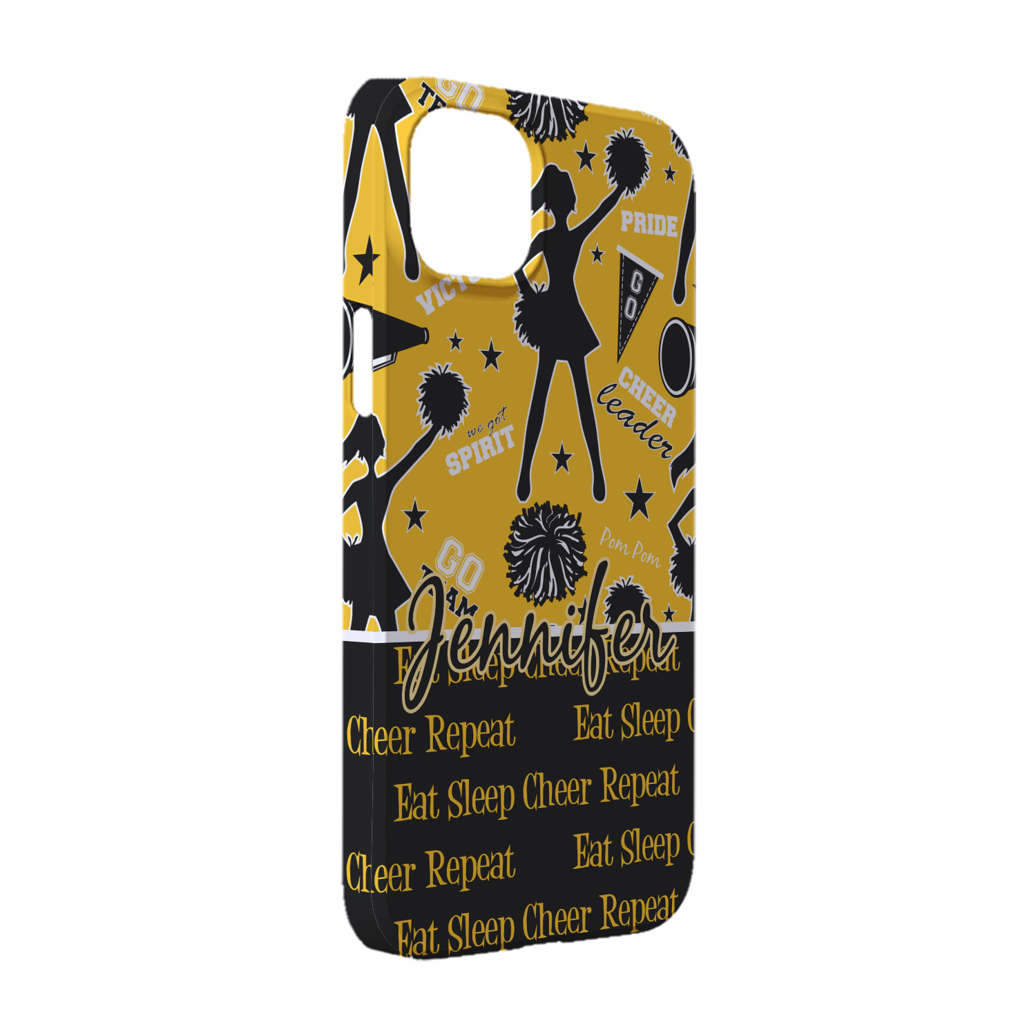 This design is a fun combo with a bright yellow and black. The two colors are a great contrast to one another. The top half of the design has a cheerleader sillhouette as well as words like "cheerleader" and "victory." The bottom half has a background that says eat, sleep, cheer, repeat. Your personalization goes right in between these two backgrounds right in the middle.