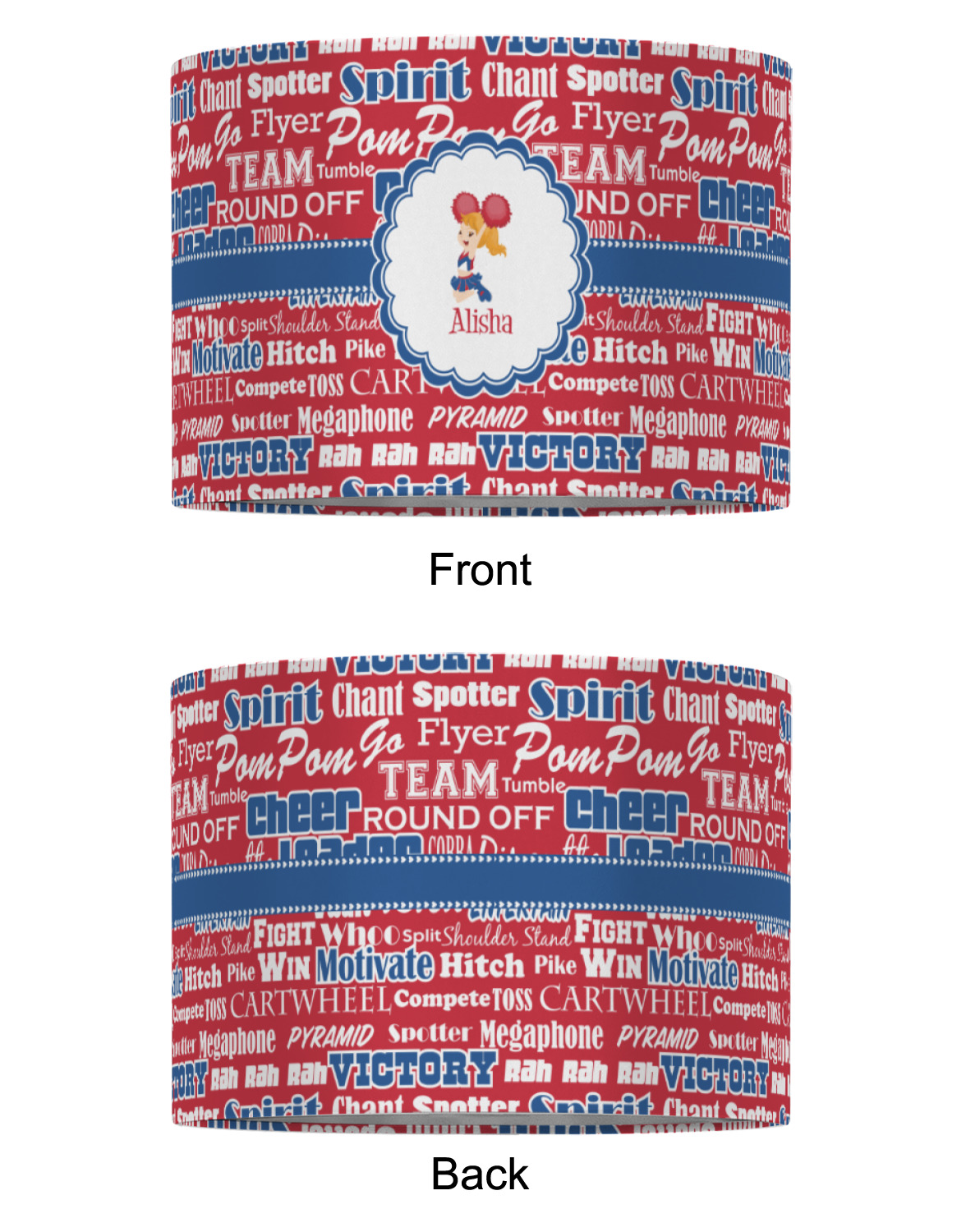 This design is perfect for cheerleaders. The background of the design is a word cloud of cheer words - words such as spirit, victory, team, cheer leader, pom pom and so many more. The background is fully re-color-able - so you can color it with your team's colors. We chose red, blue and white as those are our school's colors!