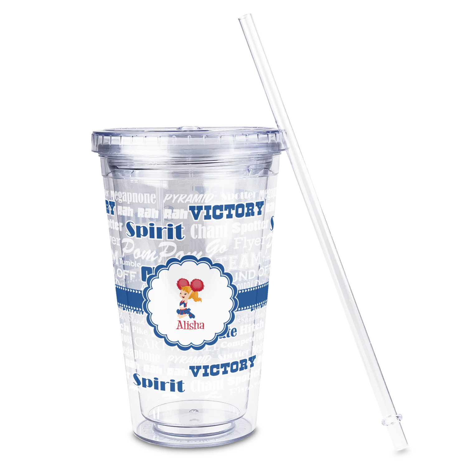 This design is perfect for cheerleaders. The background of the design is a word cloud of cheer words - words such as spirit, victory, team, cheer leader, pom pom and so many more. The background is fully re-color-able - so you can color it with your team's colors. We chose red, blue and white as those are our school's colors!