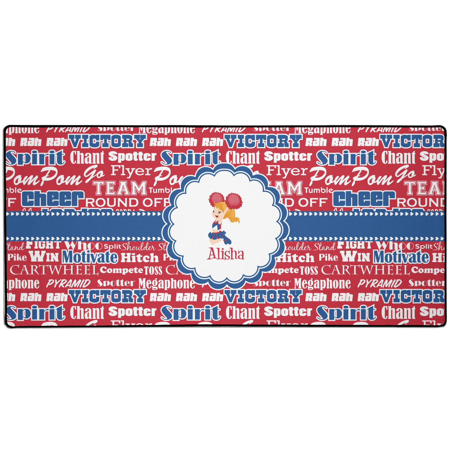This design is perfect for cheerleaders. The background of the design is a word cloud of cheer words - words such as spirit, victory, team, cheer leader, pom pom and so many more. The background is fully re-color-able - so you can color it with your team's colors. We chose red, blue and white as those are our school's colors!