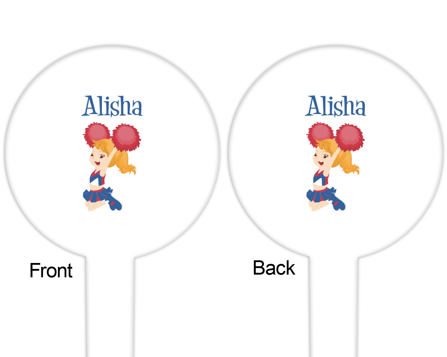 We chose a blue ribbon with hearts, along with a scalloped circle label; and then we chose a cheerleader graphic and with her name below for personalization. The cheerleader's uniform, hair and skin color can also be customized.