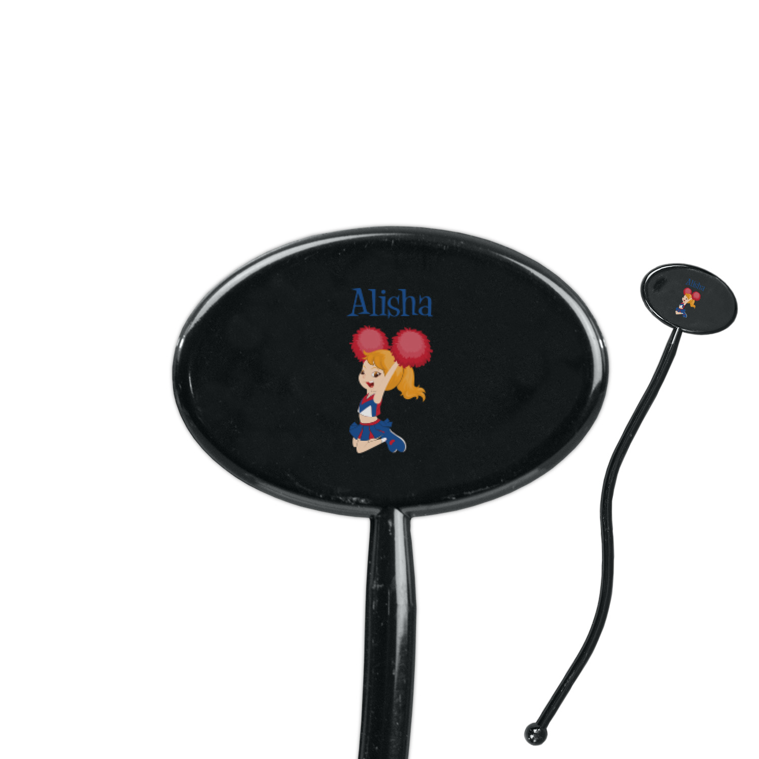 We chose a blue ribbon with hearts, along with a scalloped circle label; and then we chose a cheerleader graphic and with her name below for personalization. The cheerleader's uniform, hair and skin color can also be customized.