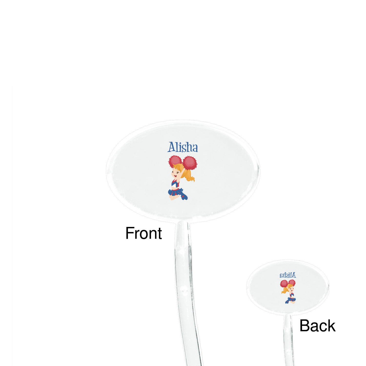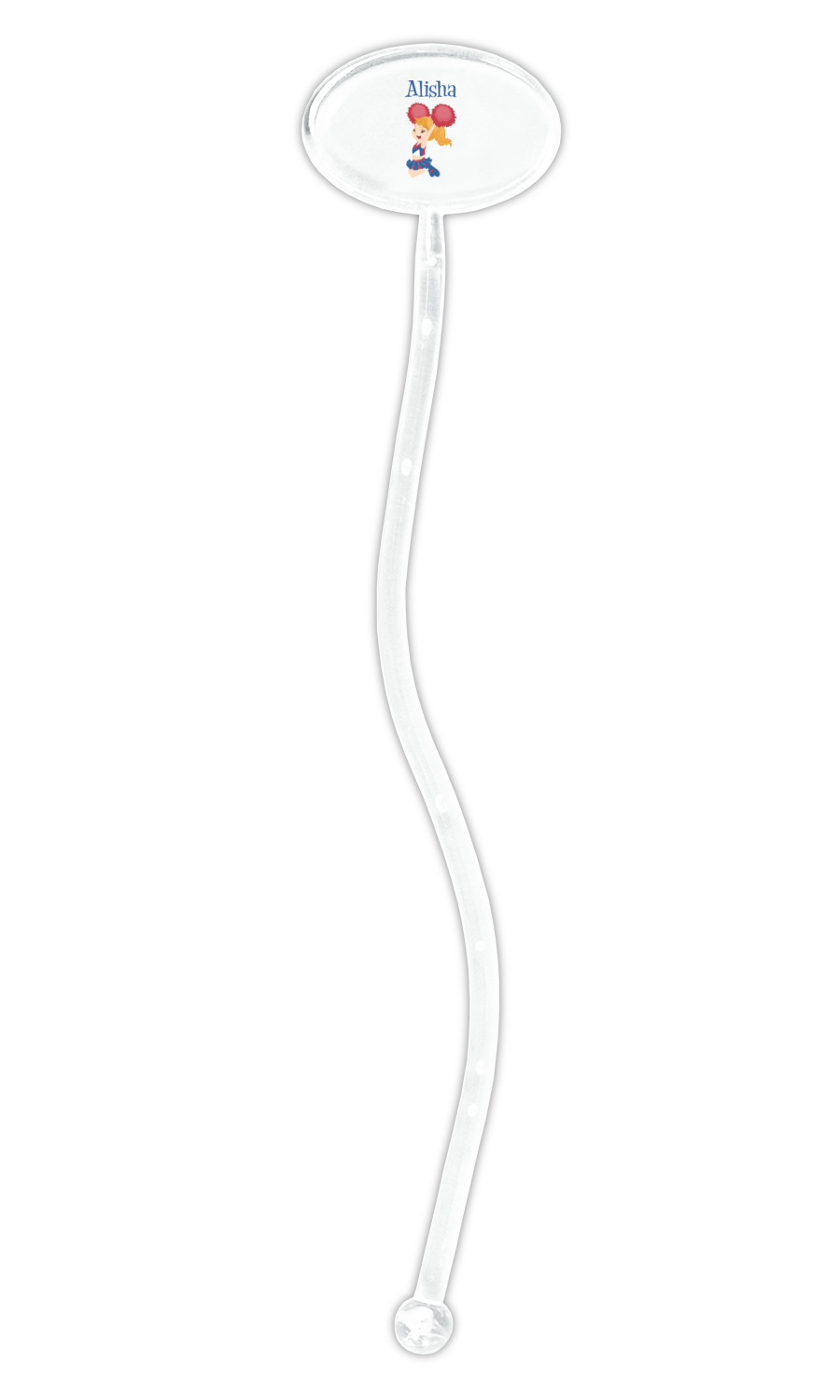 We chose a blue ribbon with hearts, along with a scalloped circle label; and then we chose a cheerleader graphic and with her name below for personalization. The cheerleader's uniform, hair and skin color can also be customized.