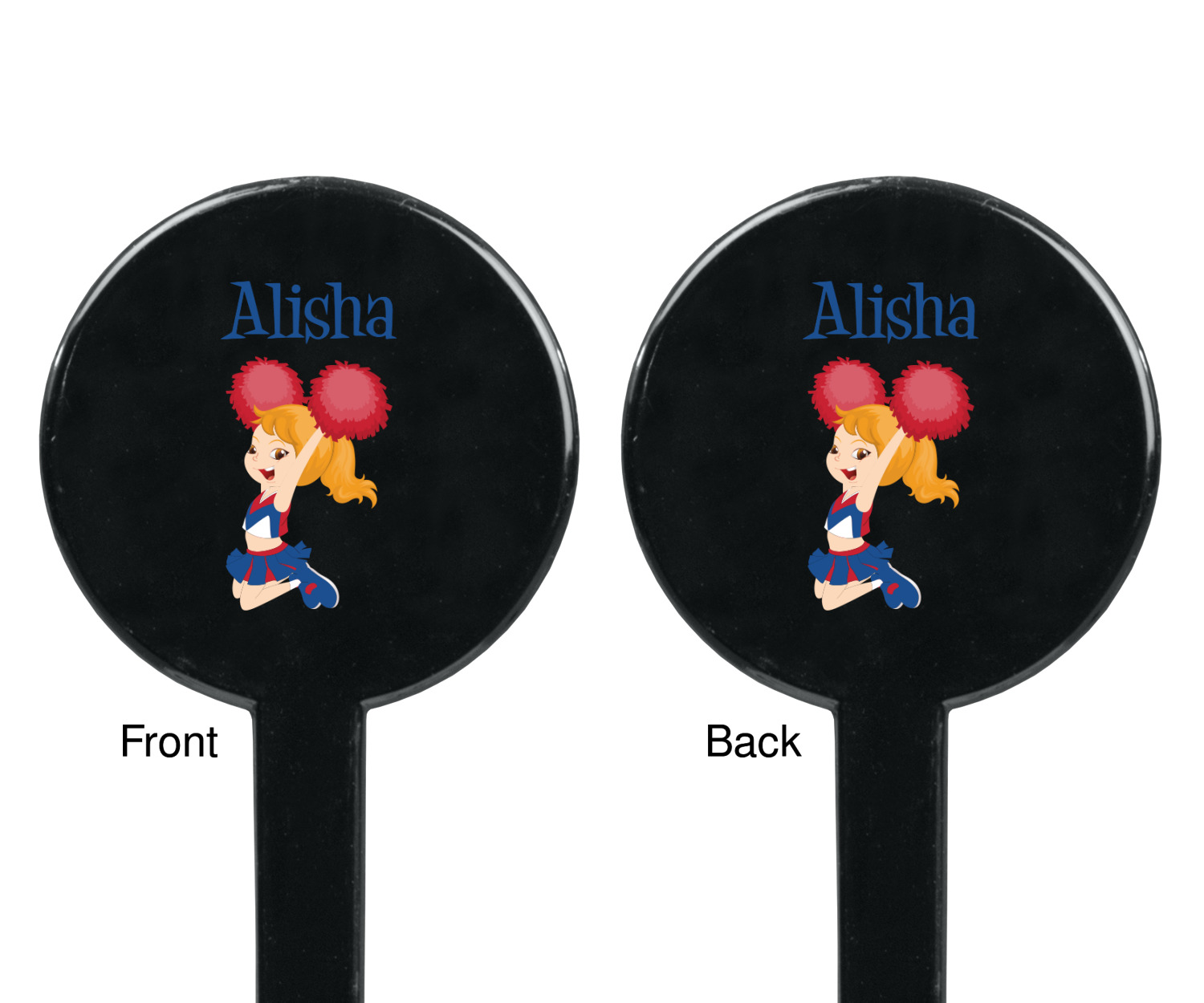 We chose a blue ribbon with hearts, along with a scalloped circle label; and then we chose a cheerleader graphic and with her name below for personalization. The cheerleader's uniform, hair and skin color can also be customized.