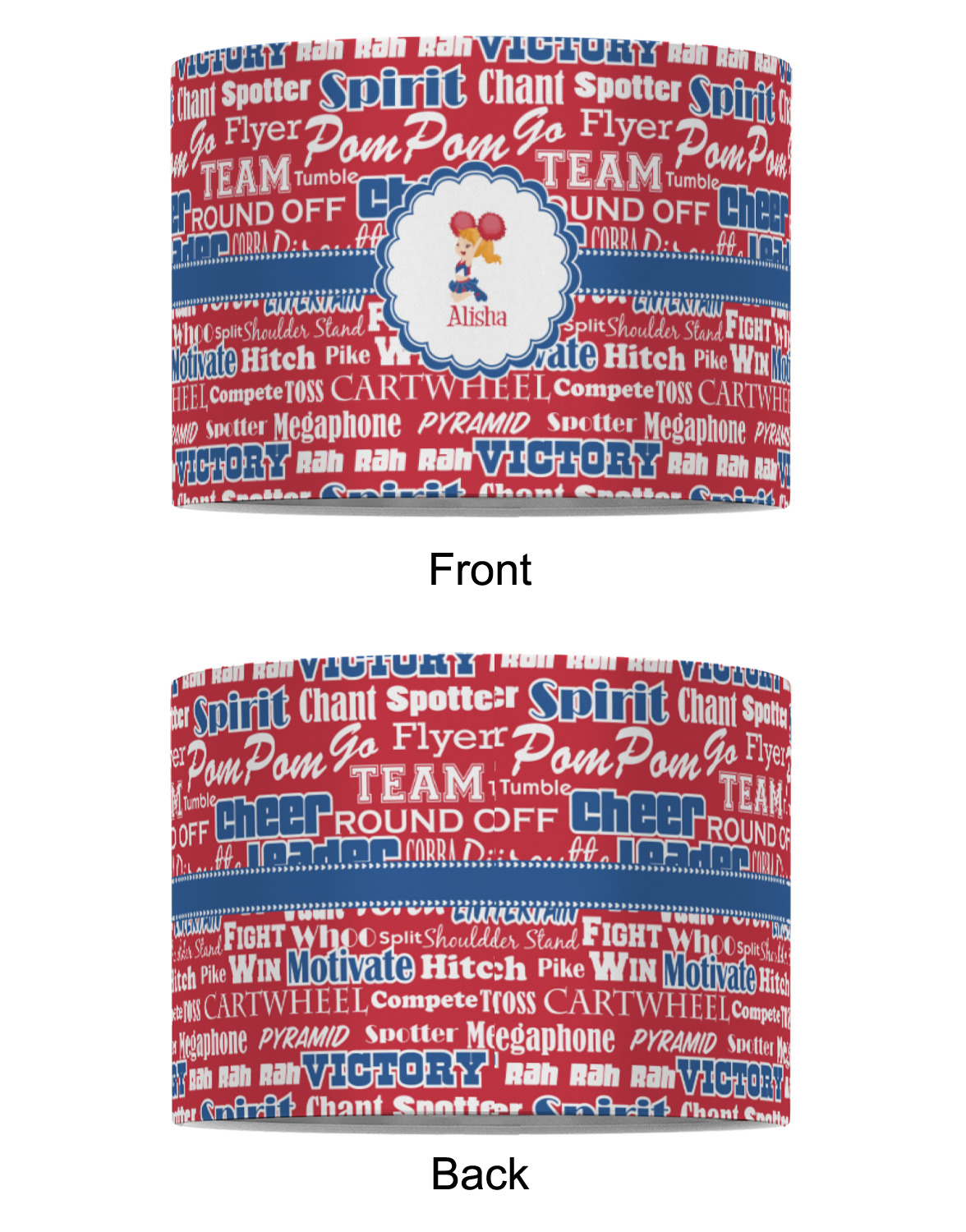 This design is perfect for cheerleaders. The background of the design is a word cloud of cheer words - words such as spirit, victory, team, cheer leader, pom pom and so many more. The background is fully re-color-able - so you can color it with your team's colors. We chose red, blue and white as those are our school's colors!