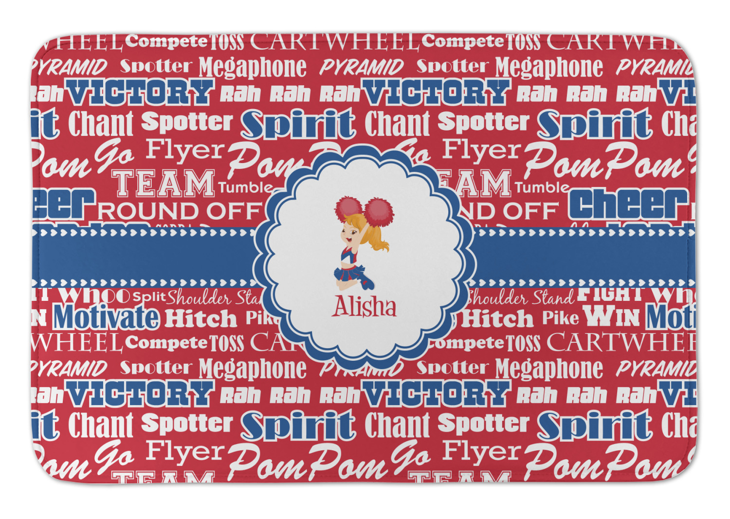 This design is perfect for cheerleaders. The background of the design is a word cloud of cheer words - words such as spirit, victory, team, cheer leader, pom pom and so many more. The background is fully re-color-able - so you can color it with your team's colors. We chose red, blue and white as those are our school's colors!