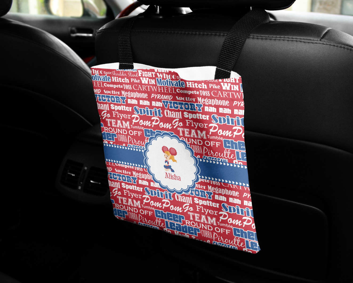 These car back seat organizers are sturdy tote-like bags, fabricated from a robust polyester, and features a single handle on the back side. The strap features an attachable velcro for easy attachment to headrests, grocery carts, car seats, and more. Simply undo the velcro, loop the strap around the headrest, reattach the velcro, and let the organizer hang from the front seat. These car organizers are the perfect means of increasing your backseat's legroom, while storing multiple items in one place for better accessibility. Each car back seat organizer measures at 10 by 10 inches, and features your personalized design printed across its front and back.