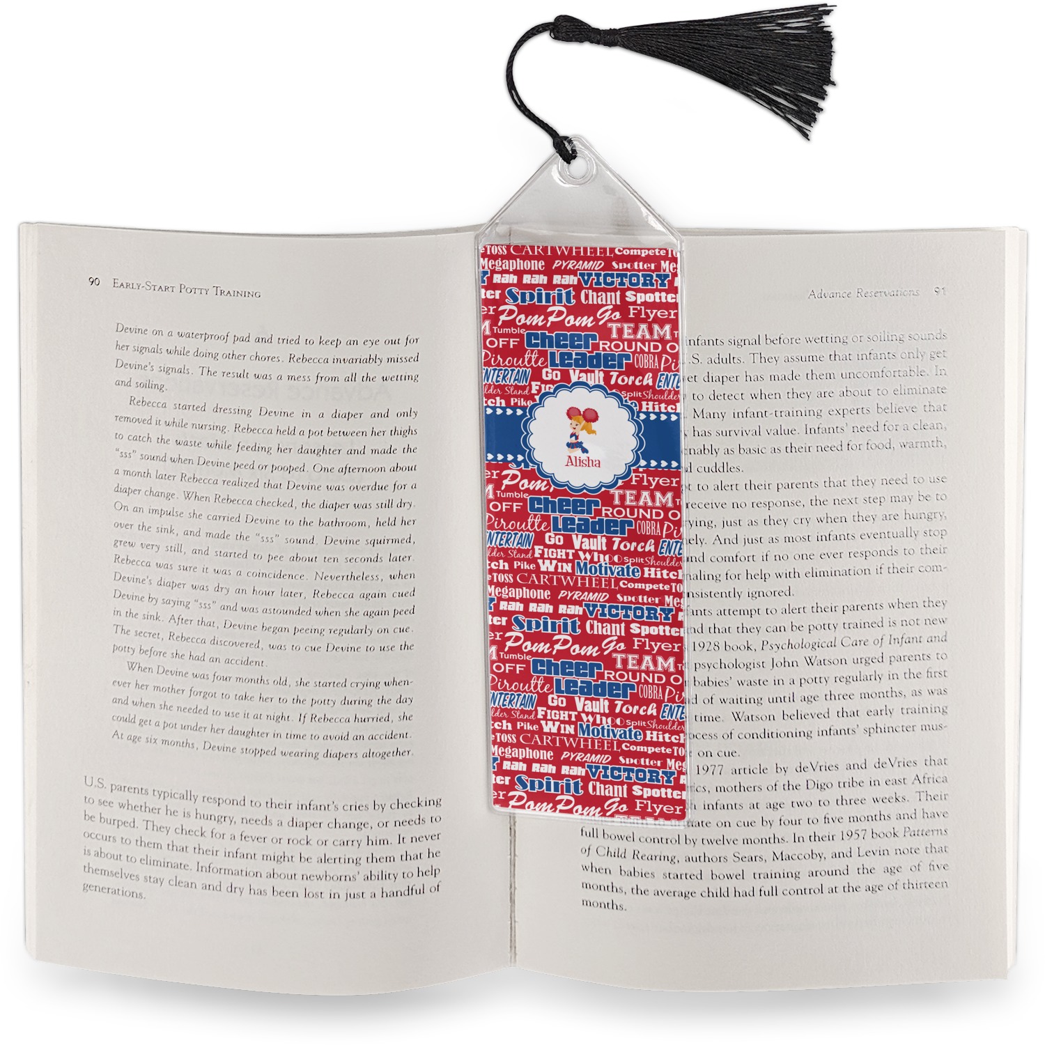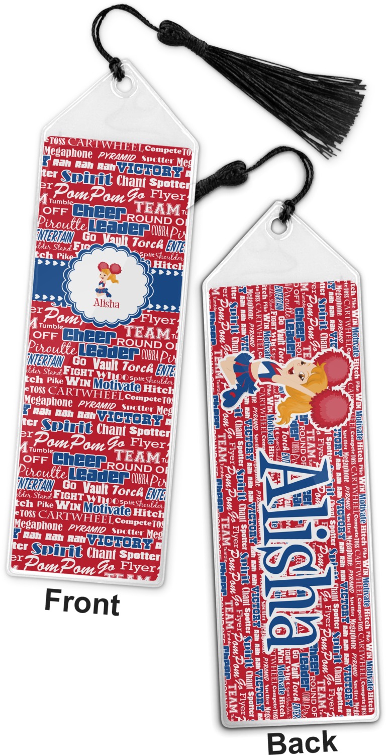 Your personalized bookmark is made of a sturdy, clear vinyl, and is approximately 7.5" x 2.25". We display your personalization on vinyl inserts that are placed on both sides. Accompanying each book marker is a black, fringe tassel that attaches to the reinforced, triangular header.
