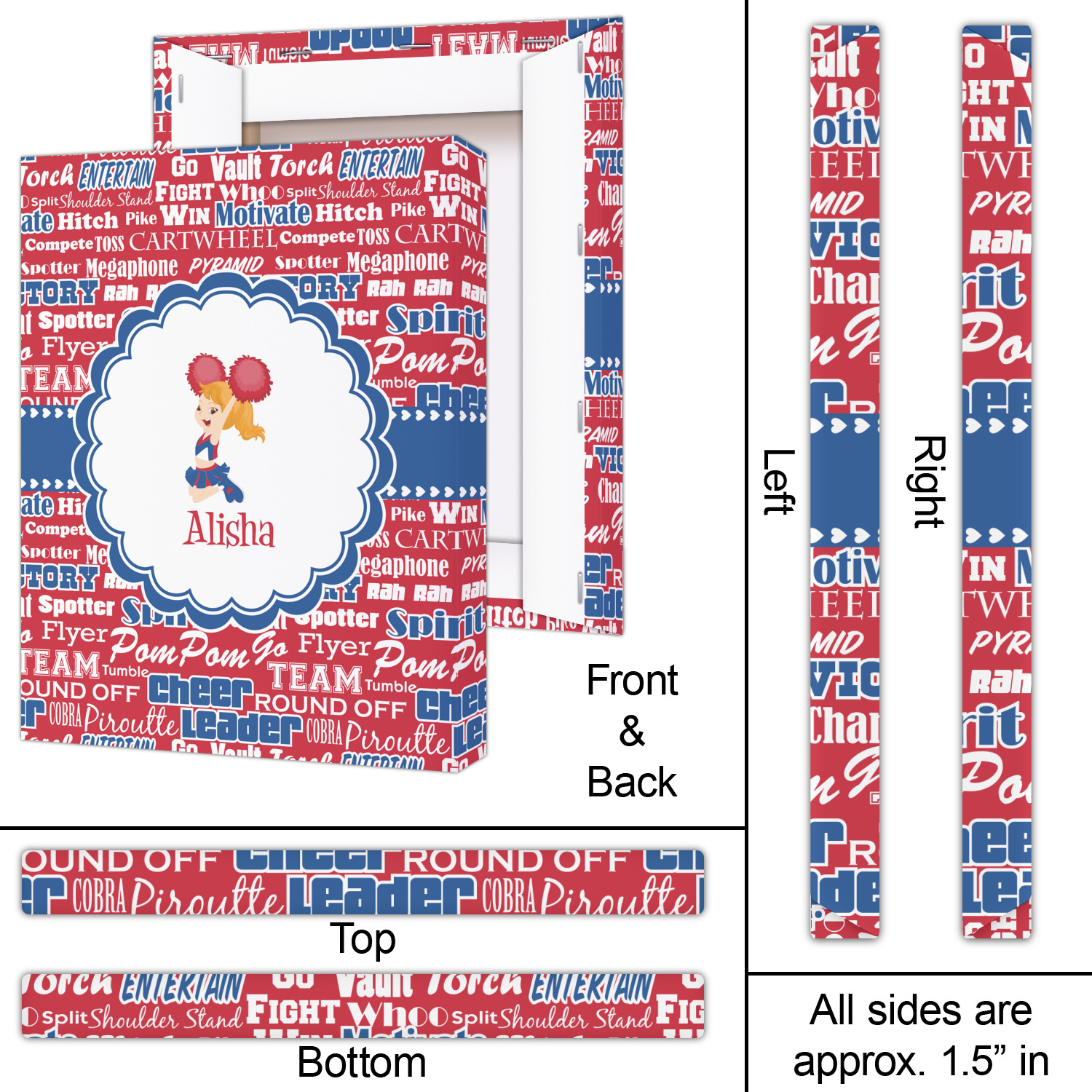 We chose a blue ribbon with hearts, along with a scalloped circle label; and then we chose a cheerleader graphic and with her name below for personalization. The cheerleader's uniform, hair and skin color can also be customized.