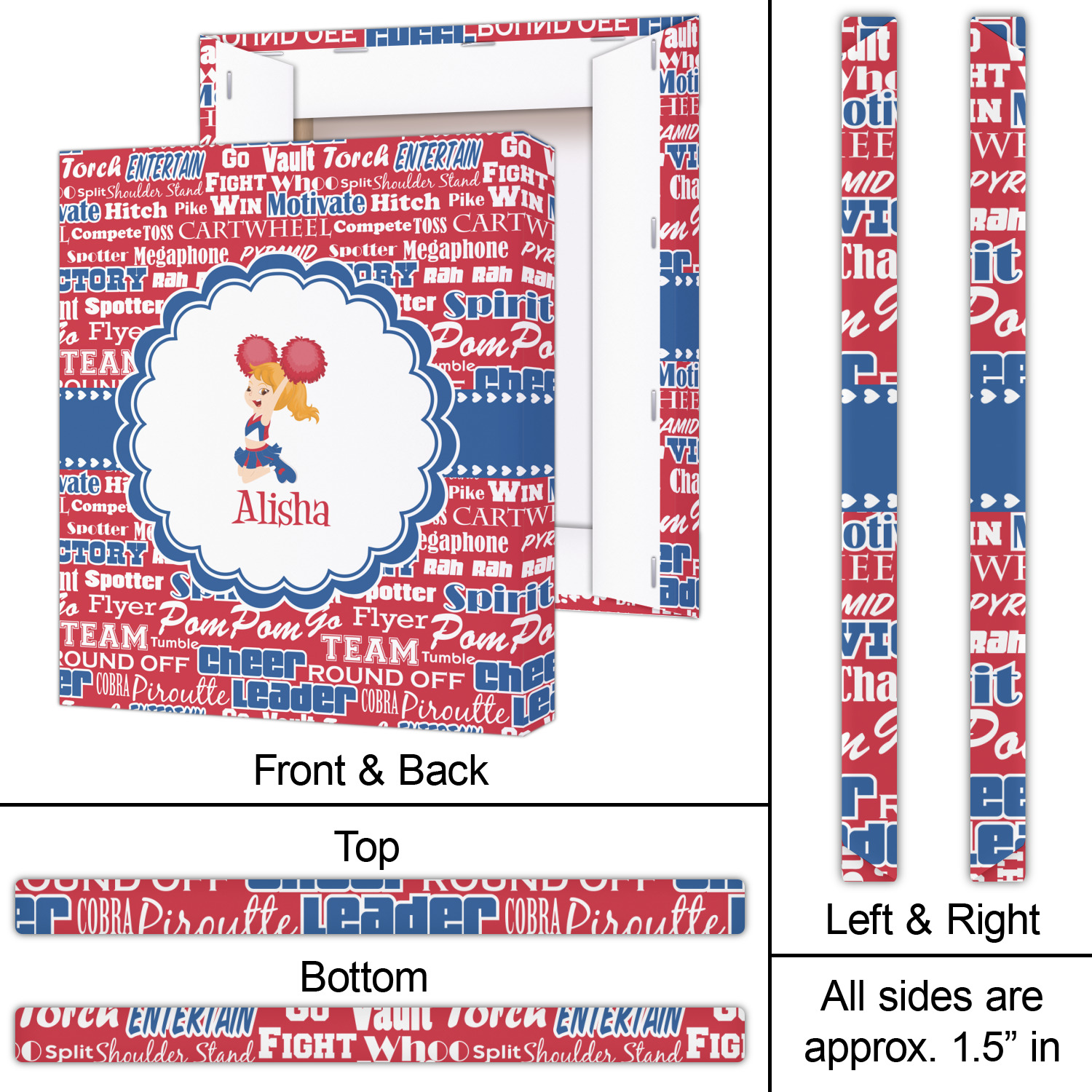 We chose a blue ribbon with hearts, along with a scalloped circle label; and then we chose a cheerleader graphic and with her name below for personalization. The cheerleader's uniform, hair and skin color can also be customized.