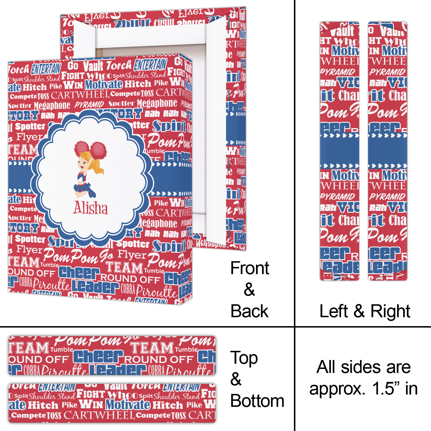 We chose a blue ribbon with hearts, along with a scalloped circle label; and then we chose a cheerleader graphic and with her name below for personalization. The cheerleader's uniform, hair and skin color can also be customized.
