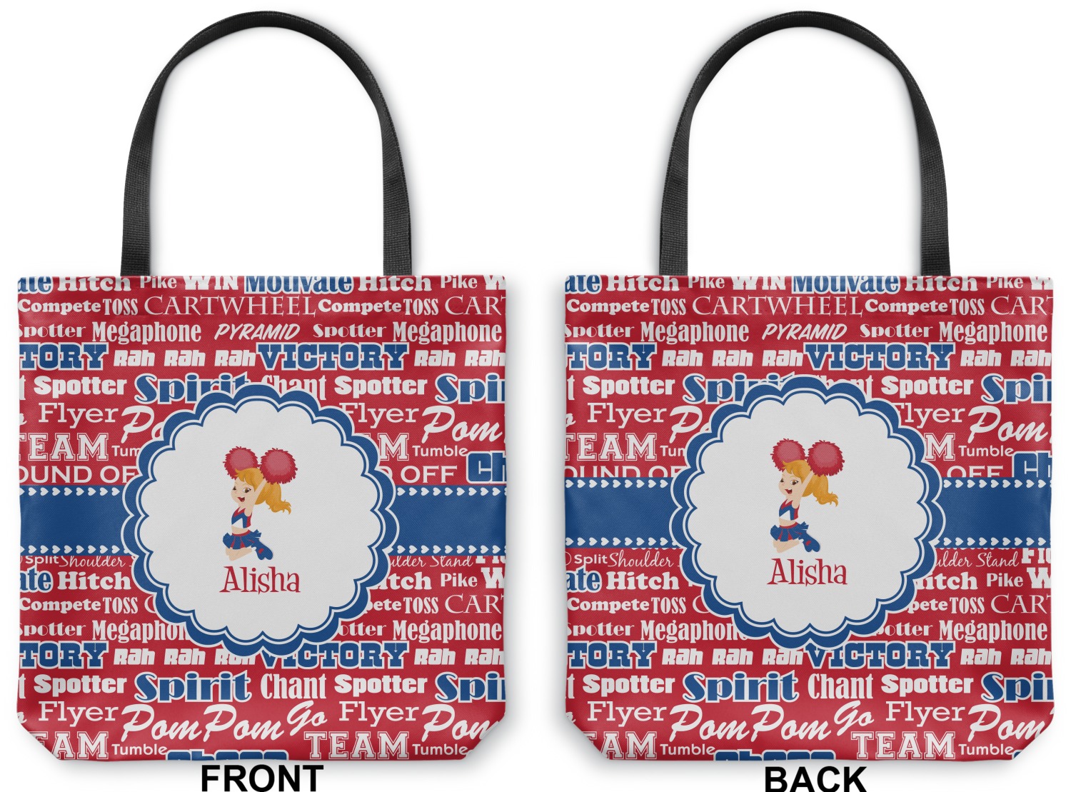 Our totes are made right here in the USA. Your design is printed on canvas fabric; the fabric is then cut and sewn on the sides and on the bottom to add an approximately 3.5 inch gusset. Black cotton handles are sewn in and reinforced. Your tote has a designs on both sides - the designs can be the same or different - the choice is yours. The inside of the tote has a black fused lining.