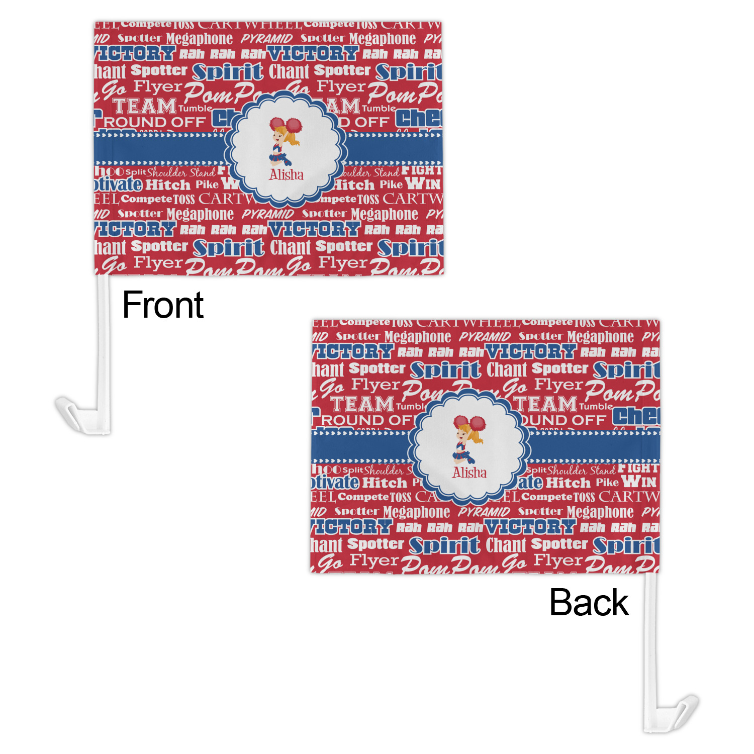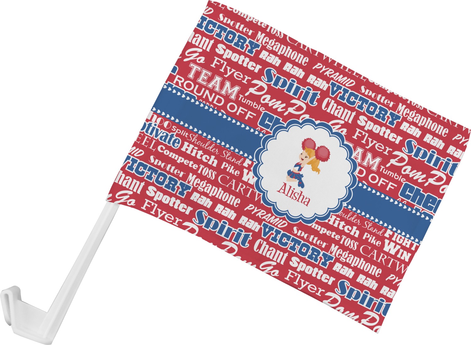 Our personalized flags are made from a durable, yet lightweight cloth that will proudly bear your logo or design of choice, while withstanding the outside elements. We have two size options - 8" x 11" and 11" x 15". Both come with a flag pole which includes a clip that secures the pole to the side window, whether it is rolled up or down. The flags are printed on both sides to display your design from all directions.