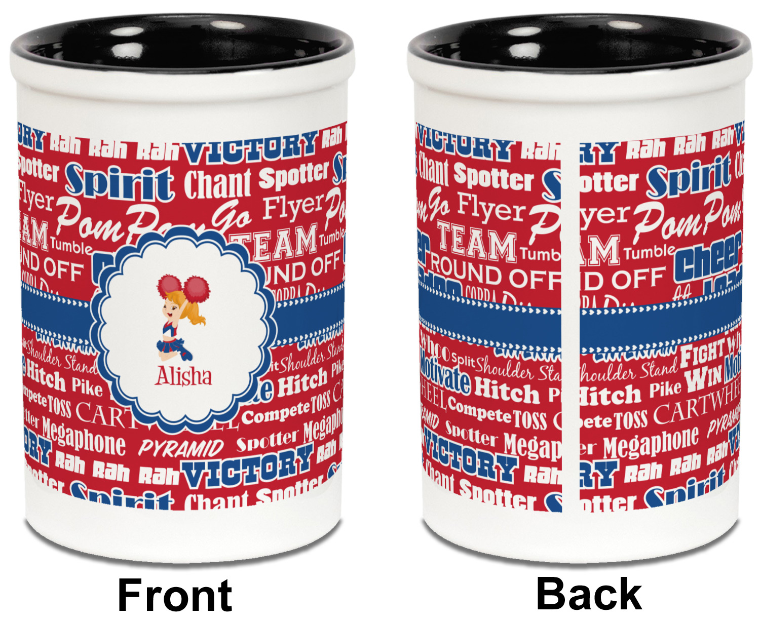 This design is perfect for cheerleaders. The background of the design is a word cloud of cheer words - words such as spirit, victory, team, cheer leader, pom pom and so many more. The background is fully re-color-able - so you can color it with your team's colors. We chose red, blue and white as those are our school's colors!