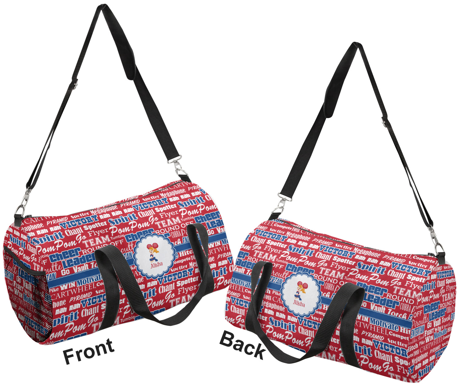 This duffle is a sturdy bag made of a canvas material. It comes in two sizes: Small (19"W x 9.5"H x 9.5"D) and Large (23"W x 12"H x 12"D). The bag is a cylindrical shape with a black adjustable strap and two handles. On one side is an elastic pouch to put a waterbottle or other small item. Your product will be sublimated with your design and is able to be designed on the front, back, and sides. Be sure to remember that the straps may cut into parts of your design if you upload your own artwork.