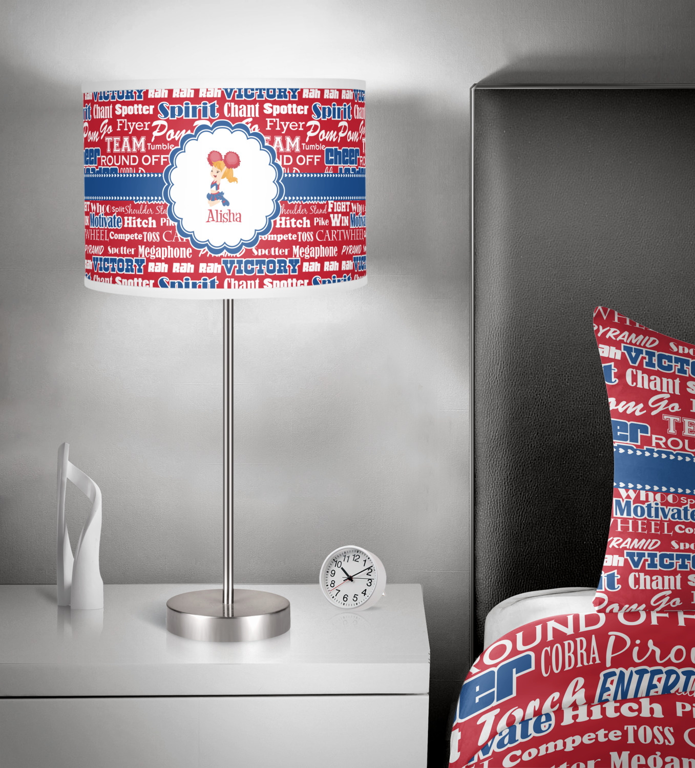 This design is perfect for cheerleaders. The background of the design is a word cloud of cheer words - words such as spirit, victory, team, cheer leader, pom pom and so many more. The background is fully re-color-able - so you can color it with your team's colors. We chose red, blue and white as those are our school's colors!