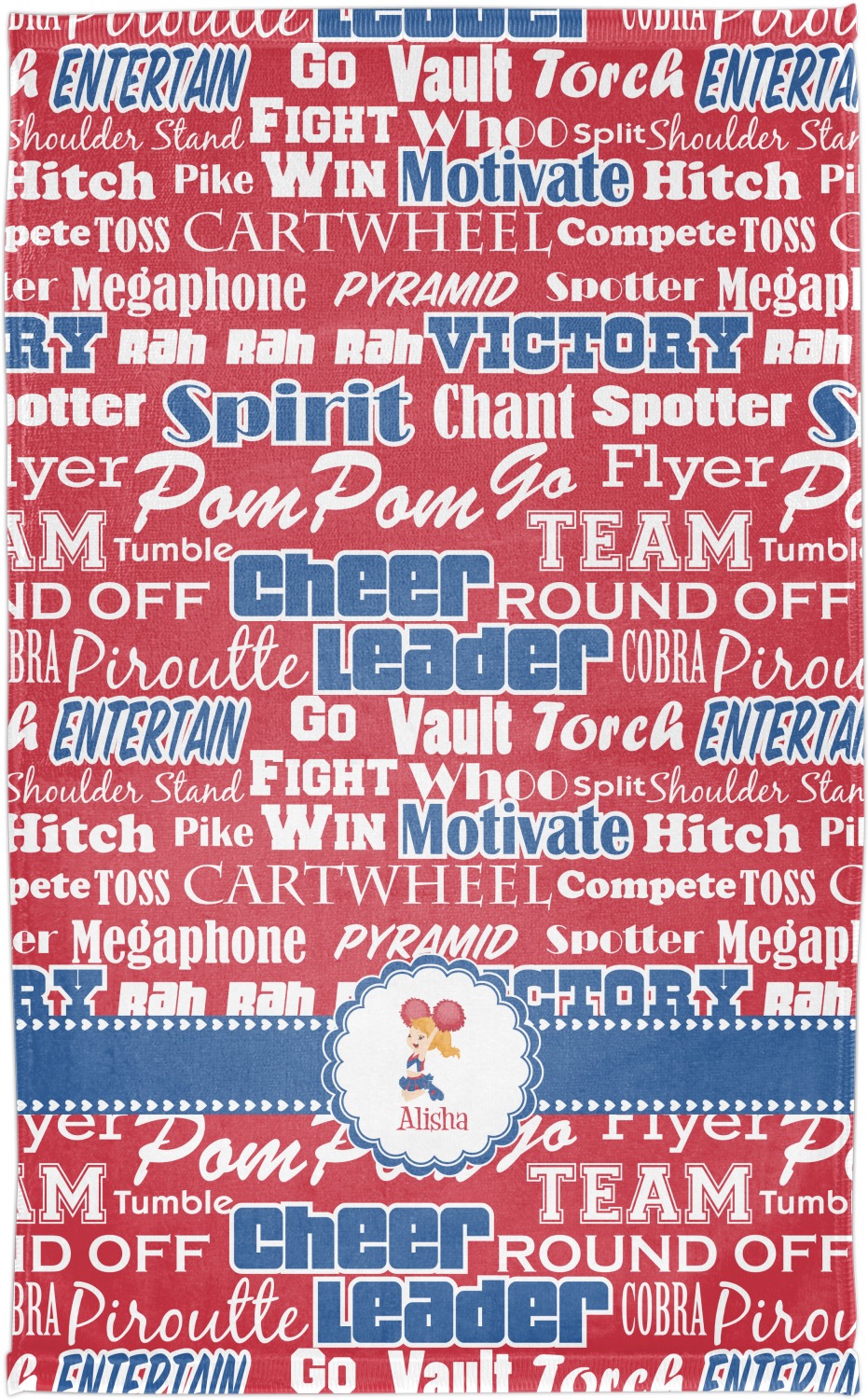 This design is perfect for cheerleaders. The background of the design is a word cloud of cheer words - words such as spirit, victory, team, cheer leader, pom pom and so many more. The background is fully re-color-able - so you can color it with your team's colors. We chose red, blue and white as those are our school's colors!