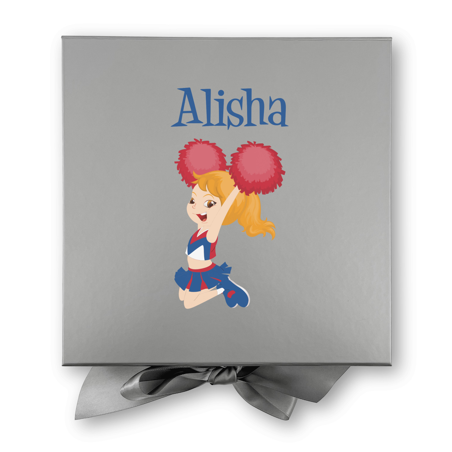 We chose a blue ribbon with hearts, along with a scalloped circle label; and then we chose a cheerleader graphic and with her name below for personalization. The cheerleader's uniform, hair and skin color can also be customized.