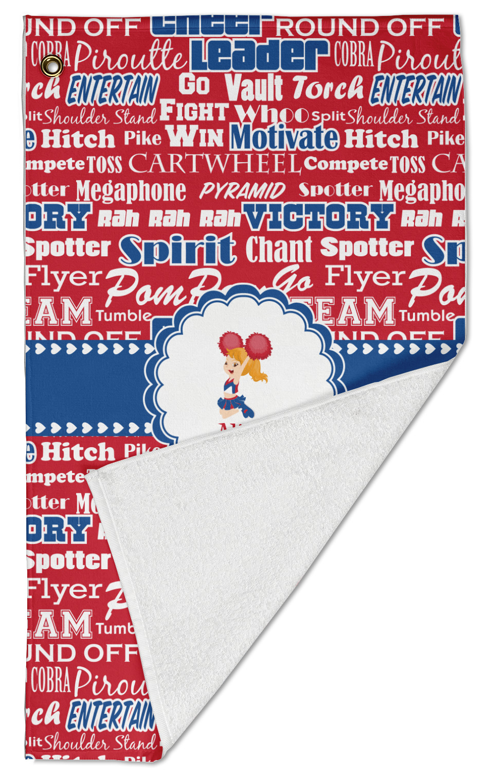 The towel is fully printed / patterned on the front polyester side; and is white on terrycloth cotton backside. The towel has grommet and a pear spring clip in the top left corner. Our golf towels are available in 100s of different prints and patterns.