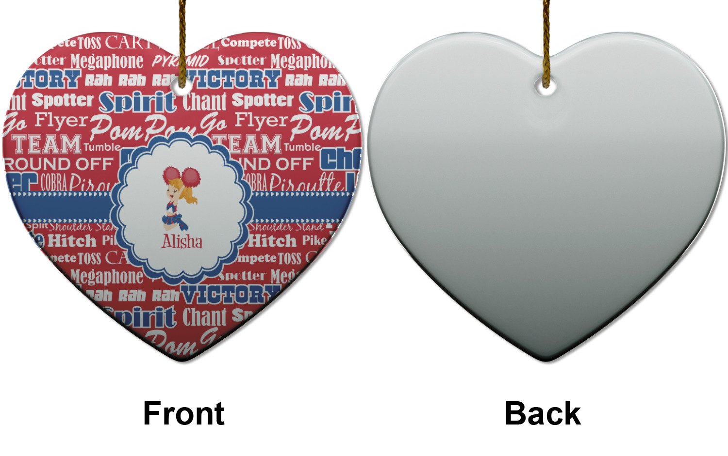 We chose a blue ribbon with hearts, along with a scalloped circle label; and then we chose a cheerleader graphic and with her name below for personalization. The cheerleader's uniform, hair and skin color can also be customized.