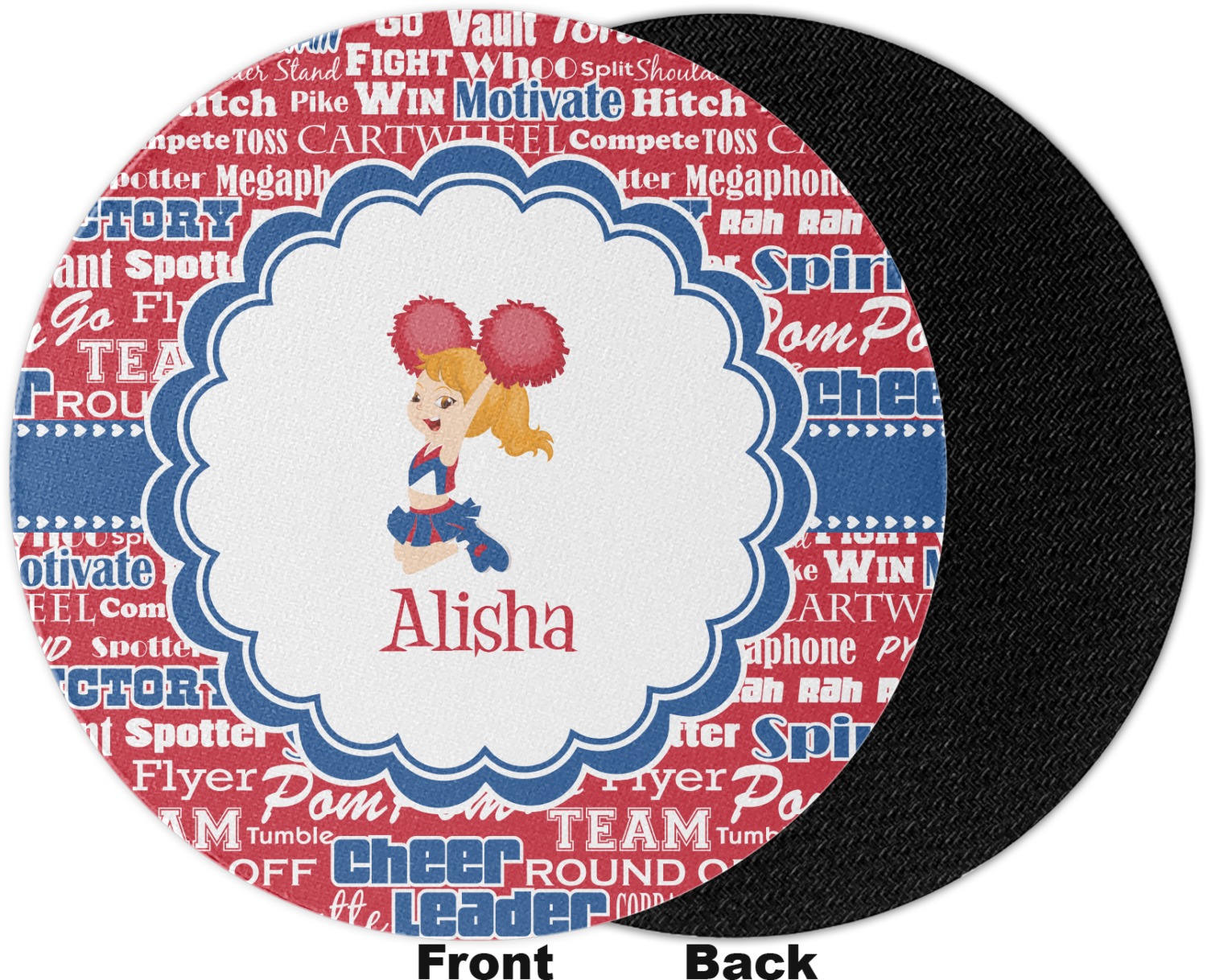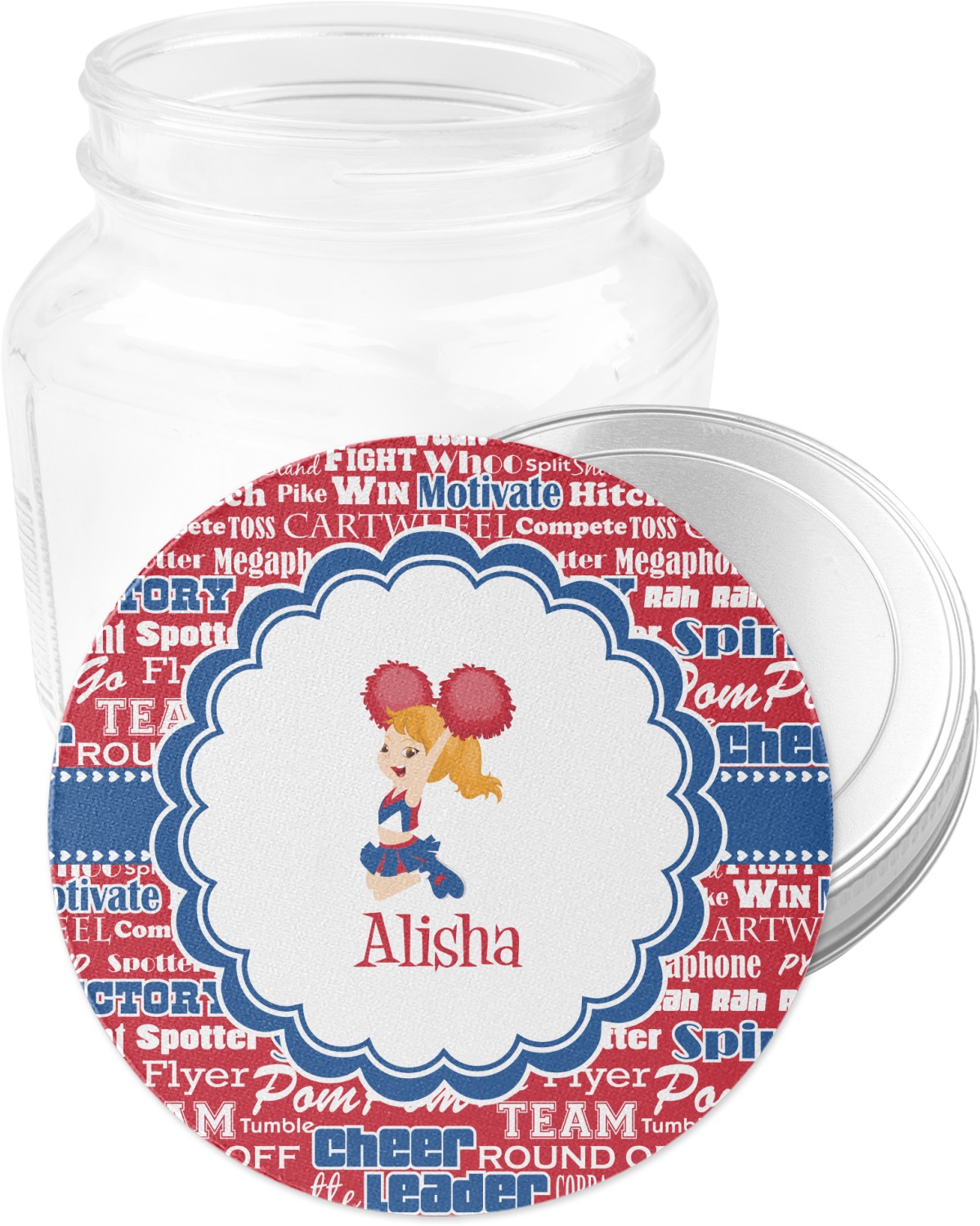 We chose a blue ribbon with hearts, along with a scalloped circle label; and then we chose a cheerleader graphic and with her name below for personalization. The cheerleader's uniform, hair and skin color can also be customized.