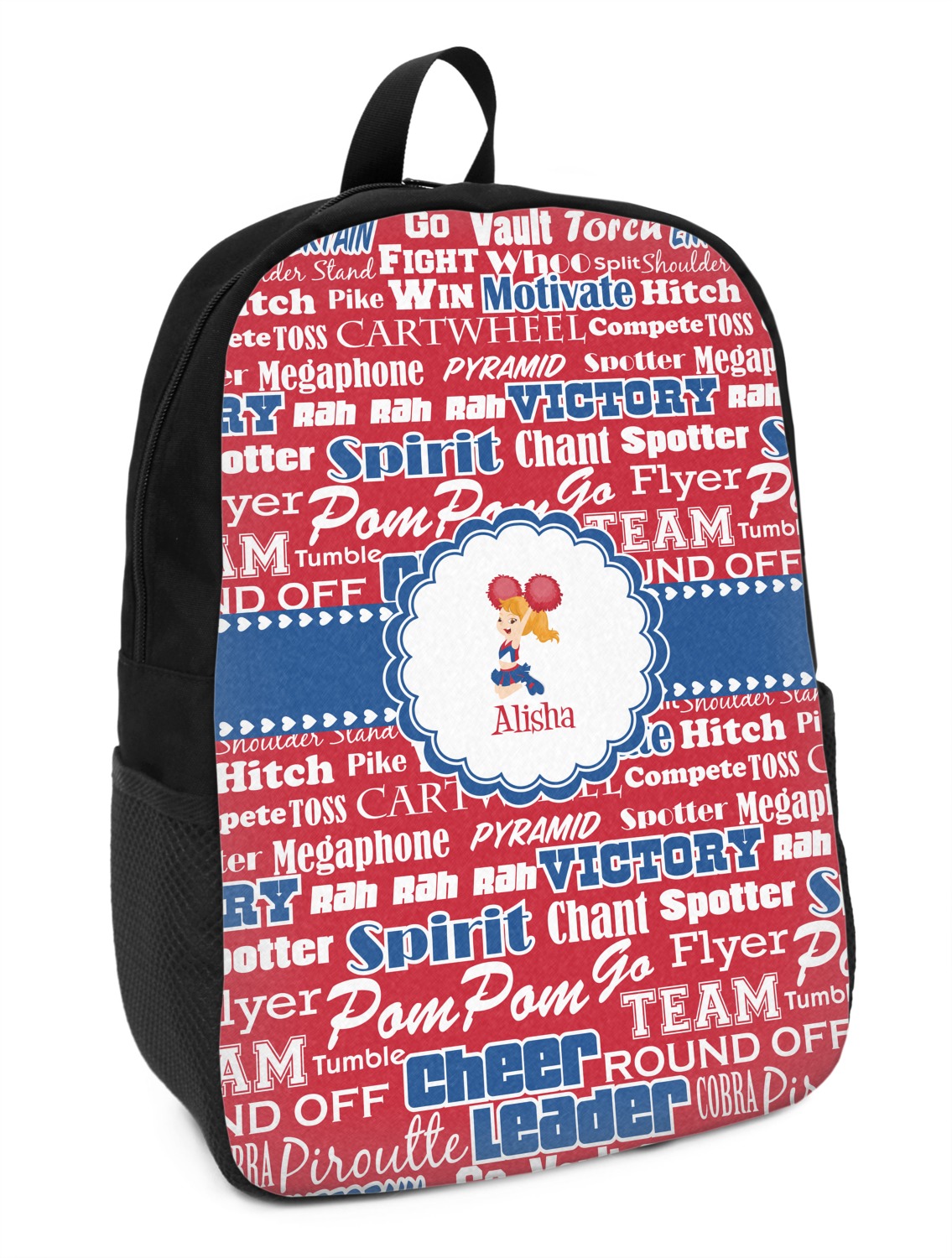 This design is perfect for cheerleaders. The background of the design is a word cloud of cheer words - words such as spirit, victory, team, cheer leader, pom pom and so many more. The background is fully re-color-able - so you can color it with your team's colors. We chose red, blue and white as those are our school's colors!