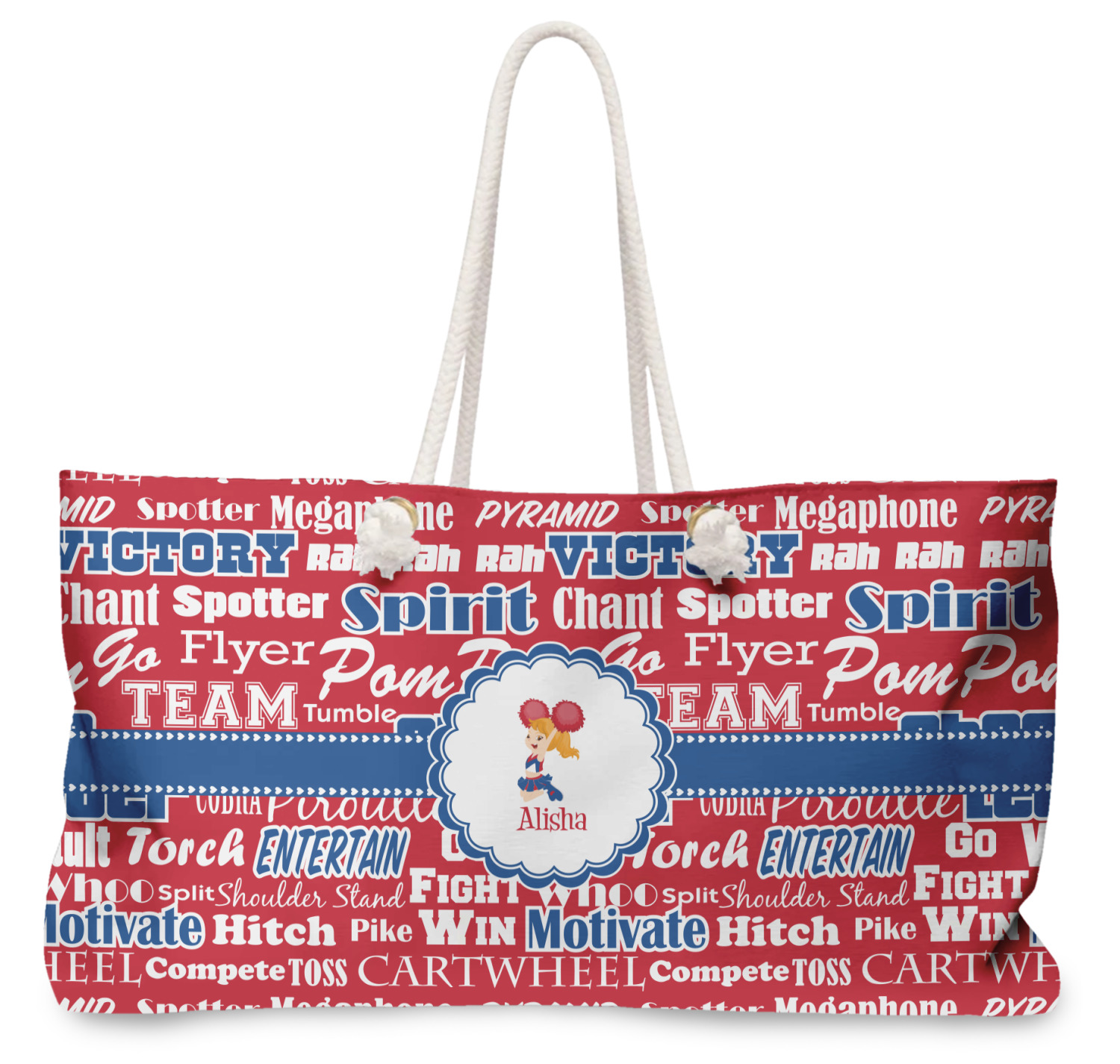 This design is perfect for cheerleaders. The background of the design is a word cloud of cheer words - words such as spirit, victory, team, cheer leader, pom pom and so many more. The background is fully re-color-able - so you can color it with your team's colors. We chose red, blue and white as those are our school's colors!