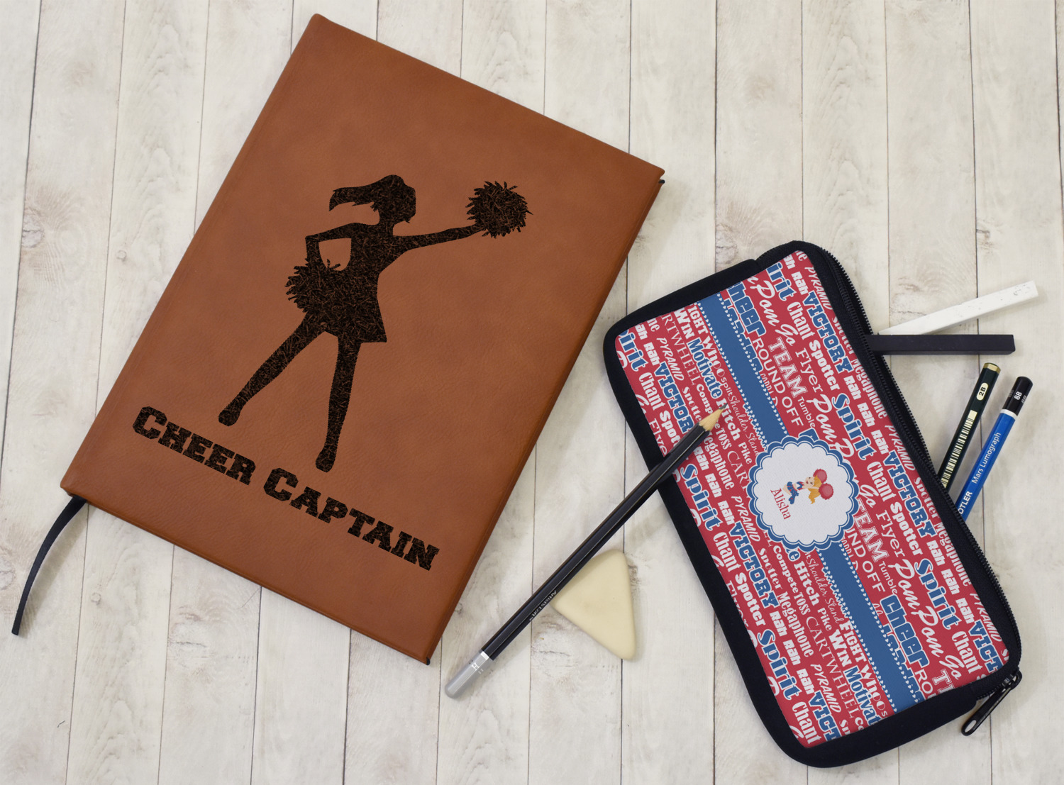 This design is perfect for cheerleaders. The background of the design is a word cloud of cheer words - words such as spirit, victory, team, cheer leader, pom pom and so many more. The background is fully re-color-able - so you can color it with your team's colors. We chose red, blue and white as those are our school's colors!