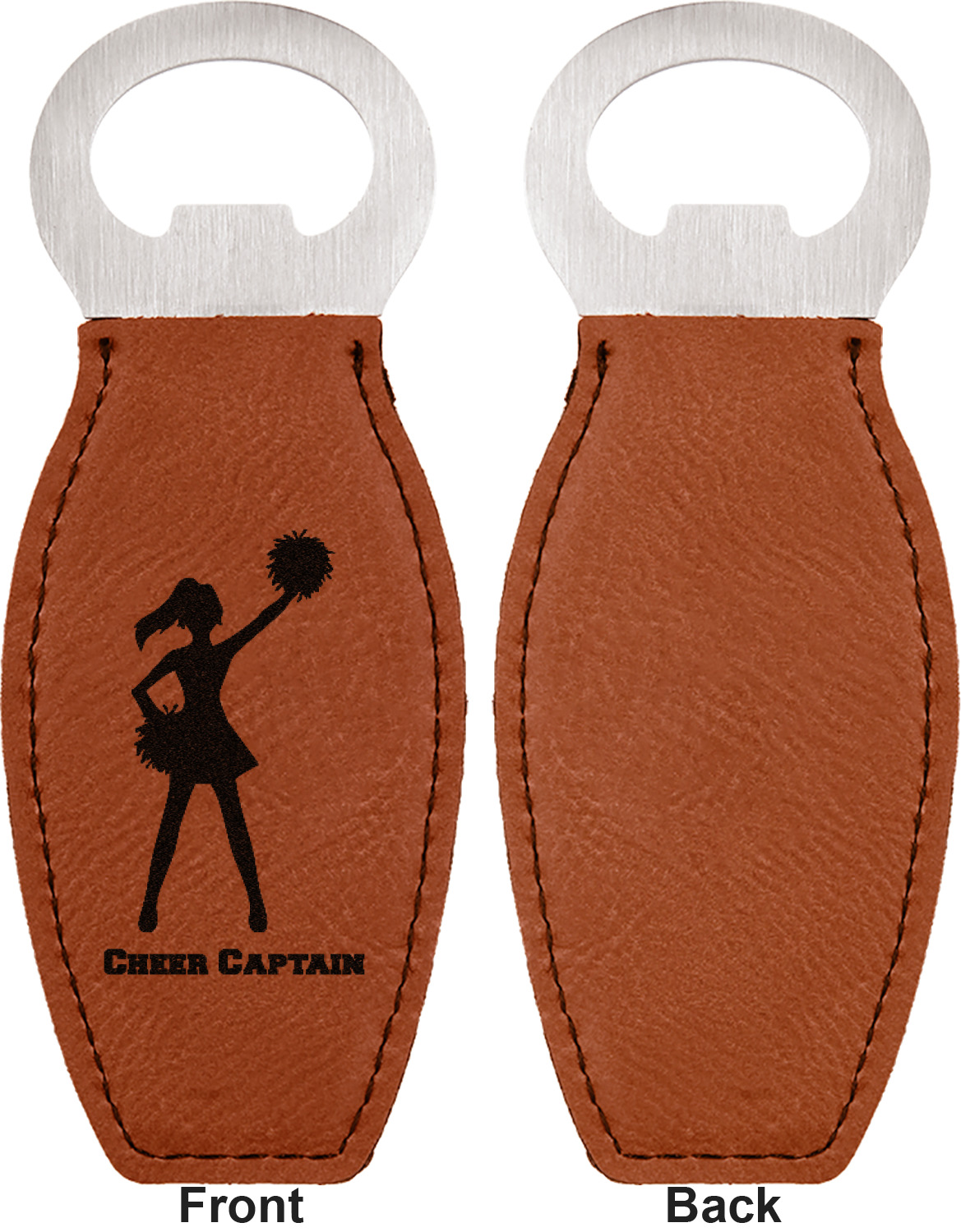 Built from stainless steel, these custom bottle openers are wrapped in a cognac-colored leatherette. Sharp, black stitching lines the edges for extra durability and a finished touch. Your personalization is laser-engraved onto the surface of this leatherette, leaving behind a crisp, black coloration. At 4.6 by 1.8 inches, this beer bottle opener gives you much of leverage when trying to open a stubborn bottle. On the opposite end of the opener, you'll find a magnet that you can use to display your new, unique bottle opener!