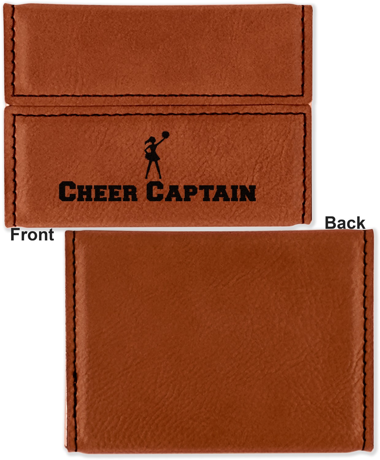 Your personalized design is laser engraved onto either the front, or the front and back of the card holder, depending on the model you purchase. Once engraved, the design will appear a darkened black against the cognac color of the leatherette.