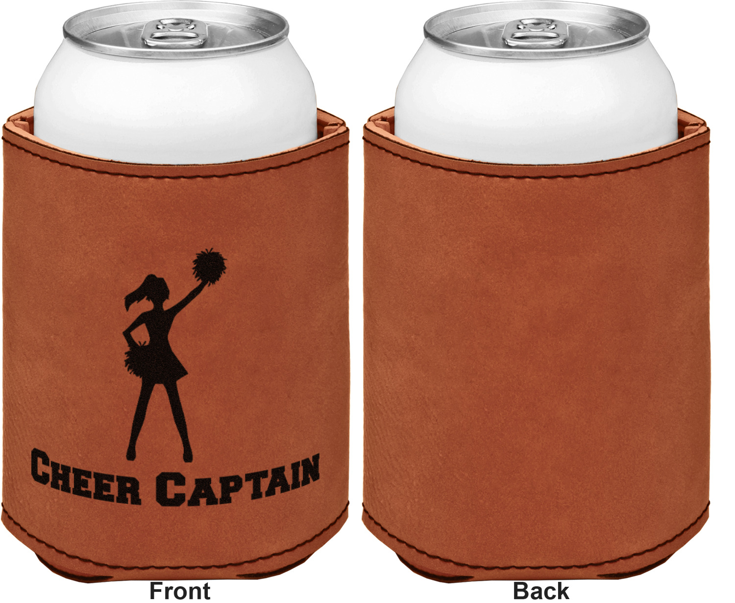 This can sleeve is made from a cognac-brown leatherette and stitched with a sturdy, black thread. A slim padding lines the inside of your can sleeve to allow for a better fit once your drink is inserted. The sleeve itself measures at 4 by 4.5 inches, allowing this custom can sleeve to accommodate most canned drinks. Your personalized design can be engraved on the front and back, or solely the front. When laser-engraved, your design appears as a black coloration which contrasts the leatherette nicely.