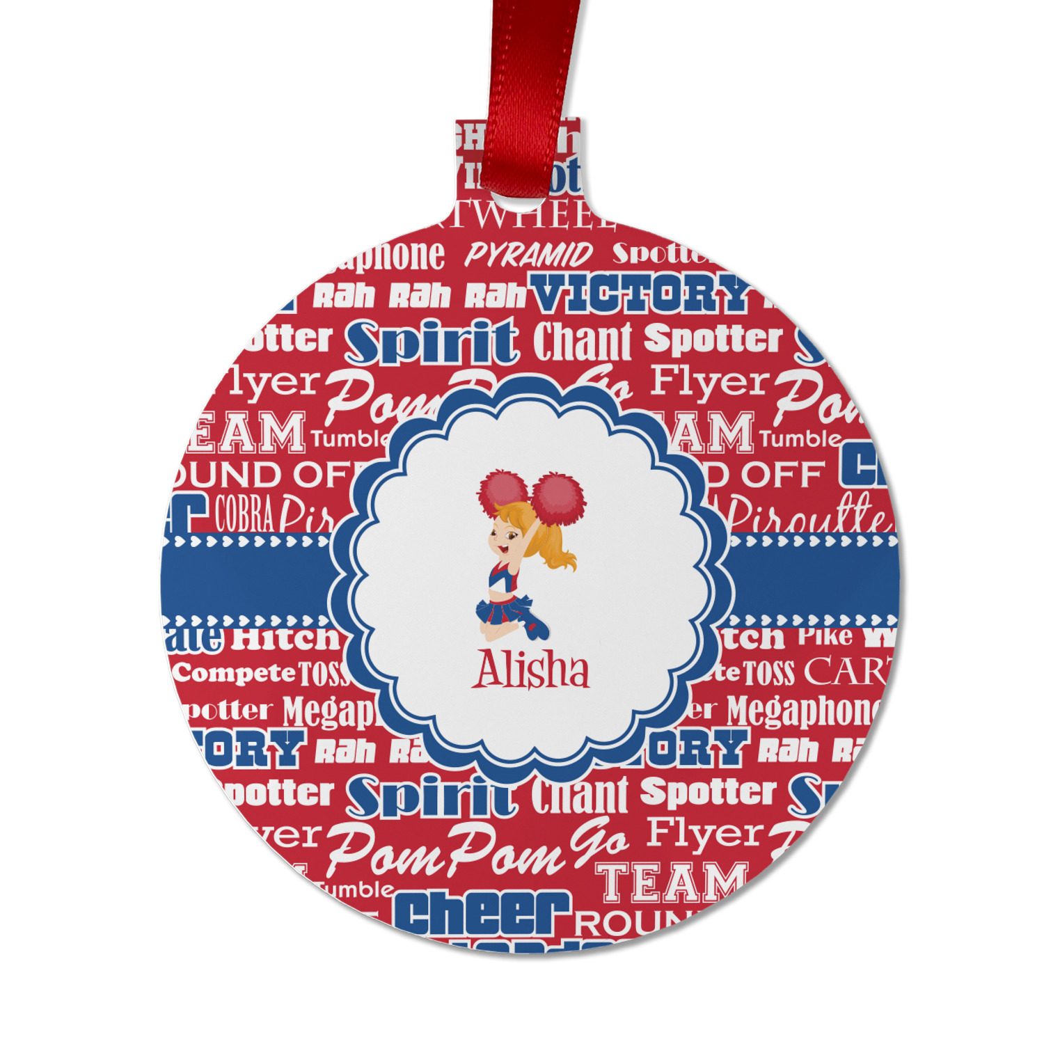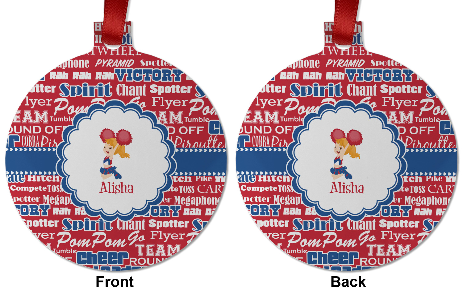 We chose a blue ribbon with hearts, along with a scalloped circle label; and then we chose a cheerleader graphic and with her name below for personalization. The cheerleader's uniform, hair and skin color can also be customized.