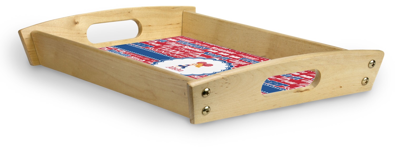 This serving tray with handles features square edges and two rounded sides, creating a very modern look. Each side is fabricated from a beautifully cut, natural wood. The bottom of the interior of the tray displays your customized design in bright, vibrant color. The tray is sold in both a black color and a natural wood look. Each variation of the wood serving tray has two sizes: Small, which is 14" x 10" x 2.25", and Large, which is 19.5" x 13.5" x 2.75".