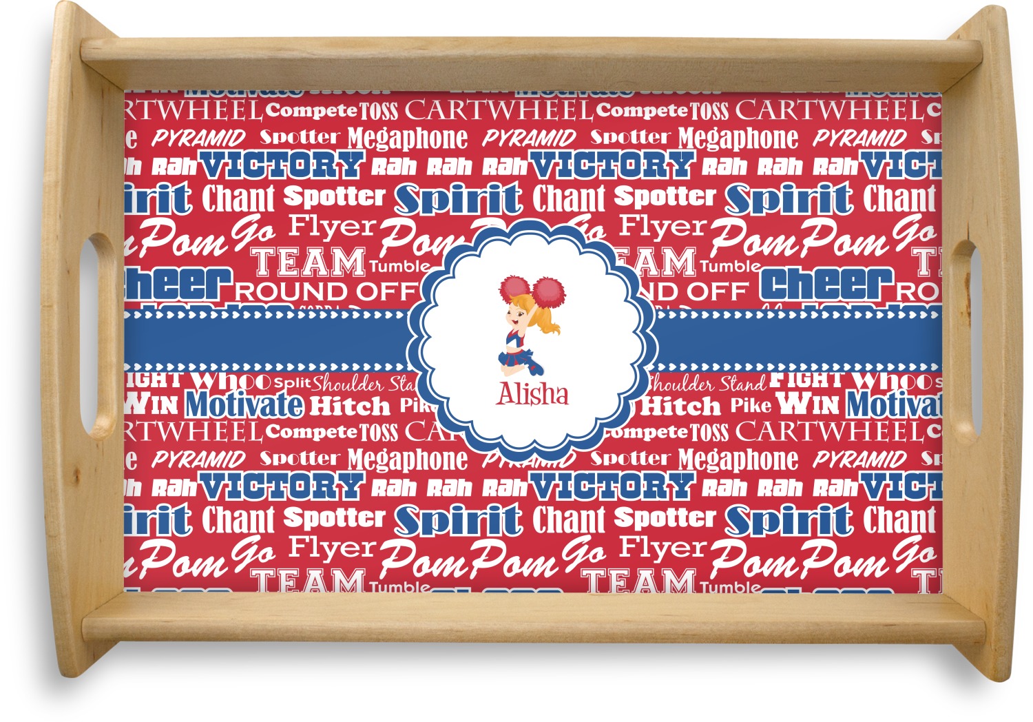 This design is perfect for cheerleaders. The background of the design is a word cloud of cheer words - words such as spirit, victory, team, cheer leader, pom pom and so many more. The background is fully re-color-able - so you can color it with your team's colors. We chose red, blue and white as those are our school's colors!
