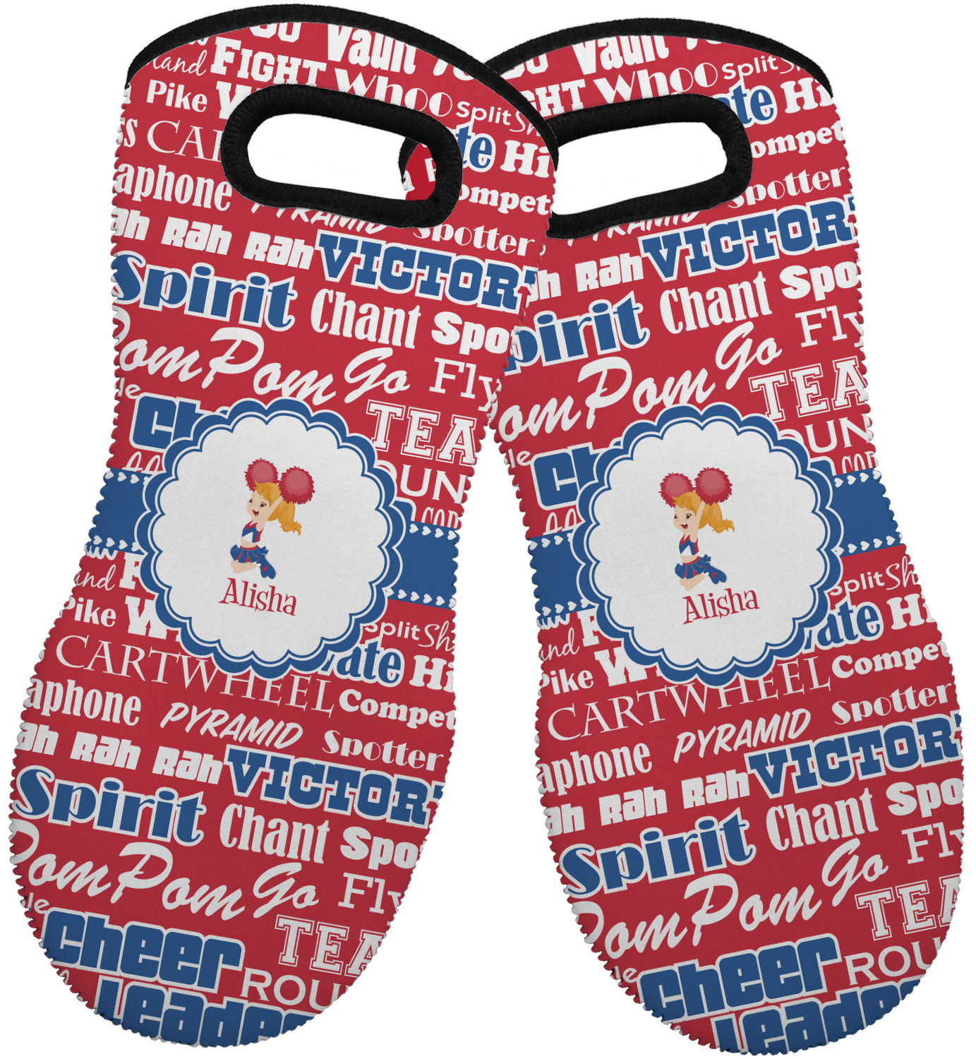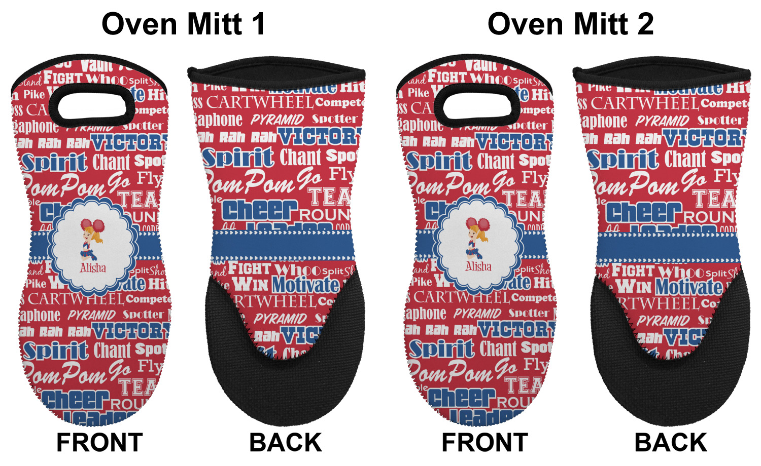 These heat resistant gloves are made entirely of a durable neoprene; the front features a softer texture, while the palm's side has a textured surface, meant to handle heat up to 500 degrees Fahrenheit. Thick, heavy duty stitching connects the two sides. A small, oval cutout appears on the front, and can be used to hang and store the mitt. Your personalization appears on the front, and the upper part of the back of the mitt. The style of these oven mitts are suitable for both the right and left hand, depending on your needs. If you need one for each hand, be sure to order two!