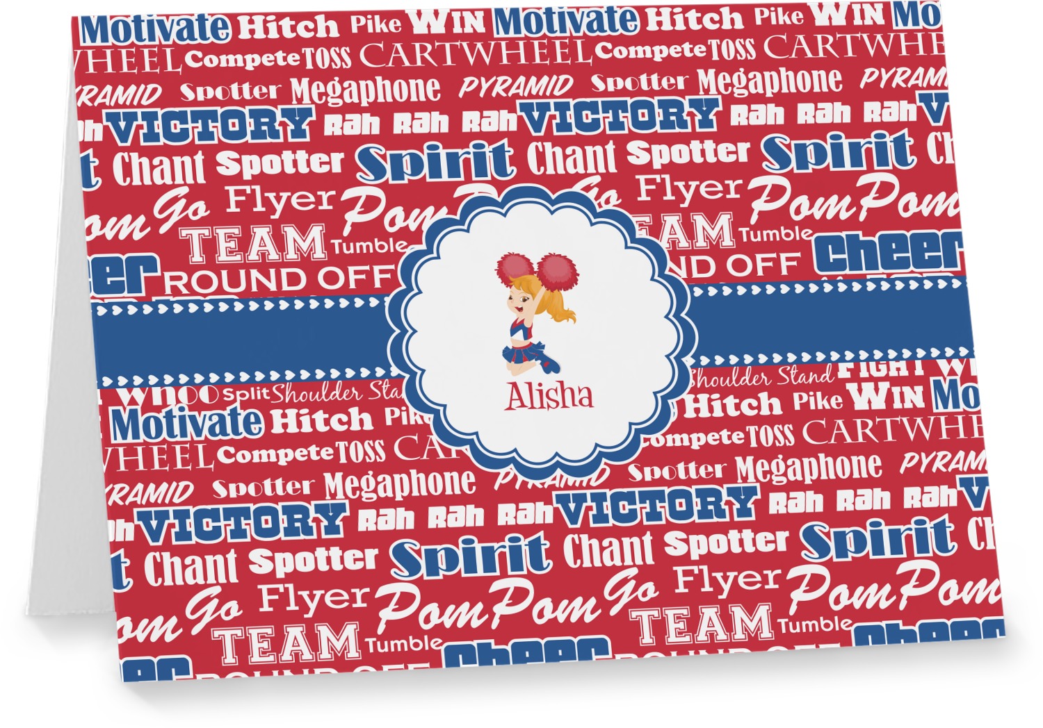 Our custom folded note cards are printed on premium 100lb. card stock and comes with white envelopes. The note card measure 5.5 by 4.25 inches and are blank on the inside for your handwritten message.