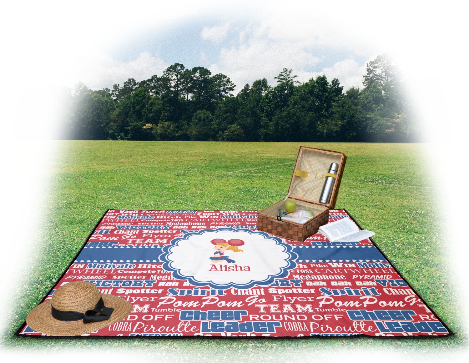 This picnic blanket is perfect for hanging out with your friends at the park or anywhere outside. The top of the blanket is made of a super soft microfiber fleece. The bottom of the blanket is made of a black material similar to a rain jacket and is water repellent as well. This will keep any wet spots on the ground from soaking through your picnic blanket. No one likes a wet blanket. The blanket measures at approximately 50" x 59" and has a nicely finished ribbon edge.