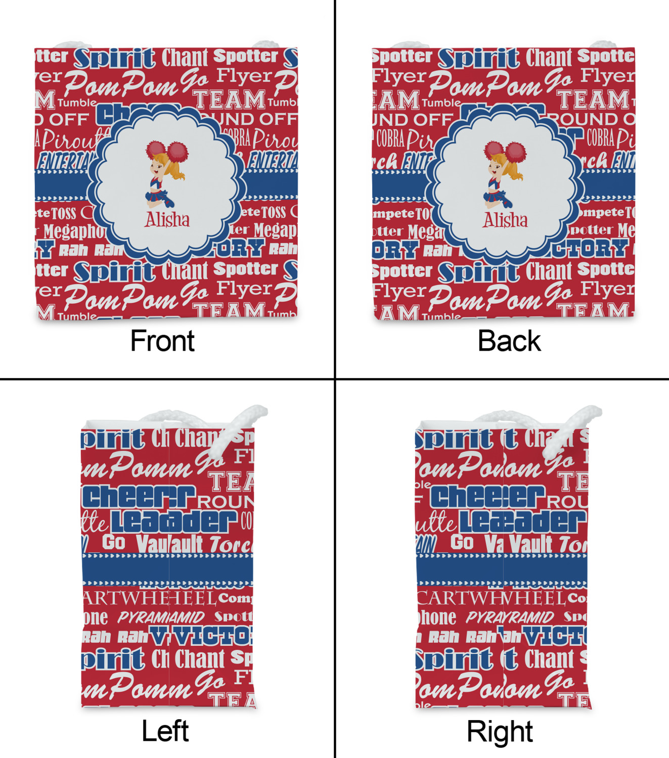 This design is perfect for cheerleaders. The background of the design is a word cloud of cheer words - words such as spirit, victory, team, cheer leader, pom pom and so many more. The background is fully re-color-able - so you can color it with your team's colors. We chose red, blue and white as those are our school's colors!