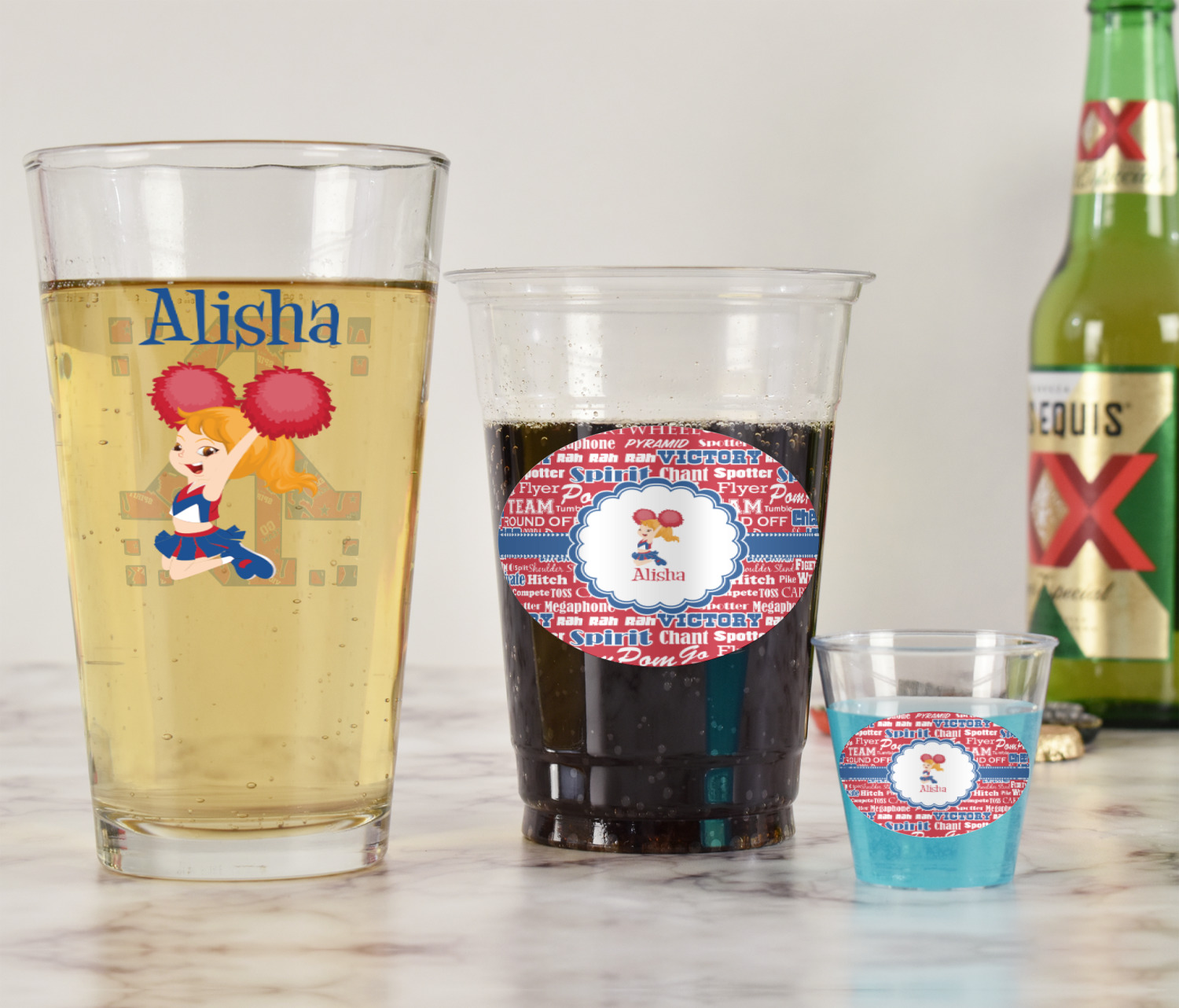 We chose a blue ribbon with hearts, along with a scalloped circle label; and then we chose a cheerleader graphic and with her name below for personalization. The cheerleader's uniform, hair and skin color can also be customized.