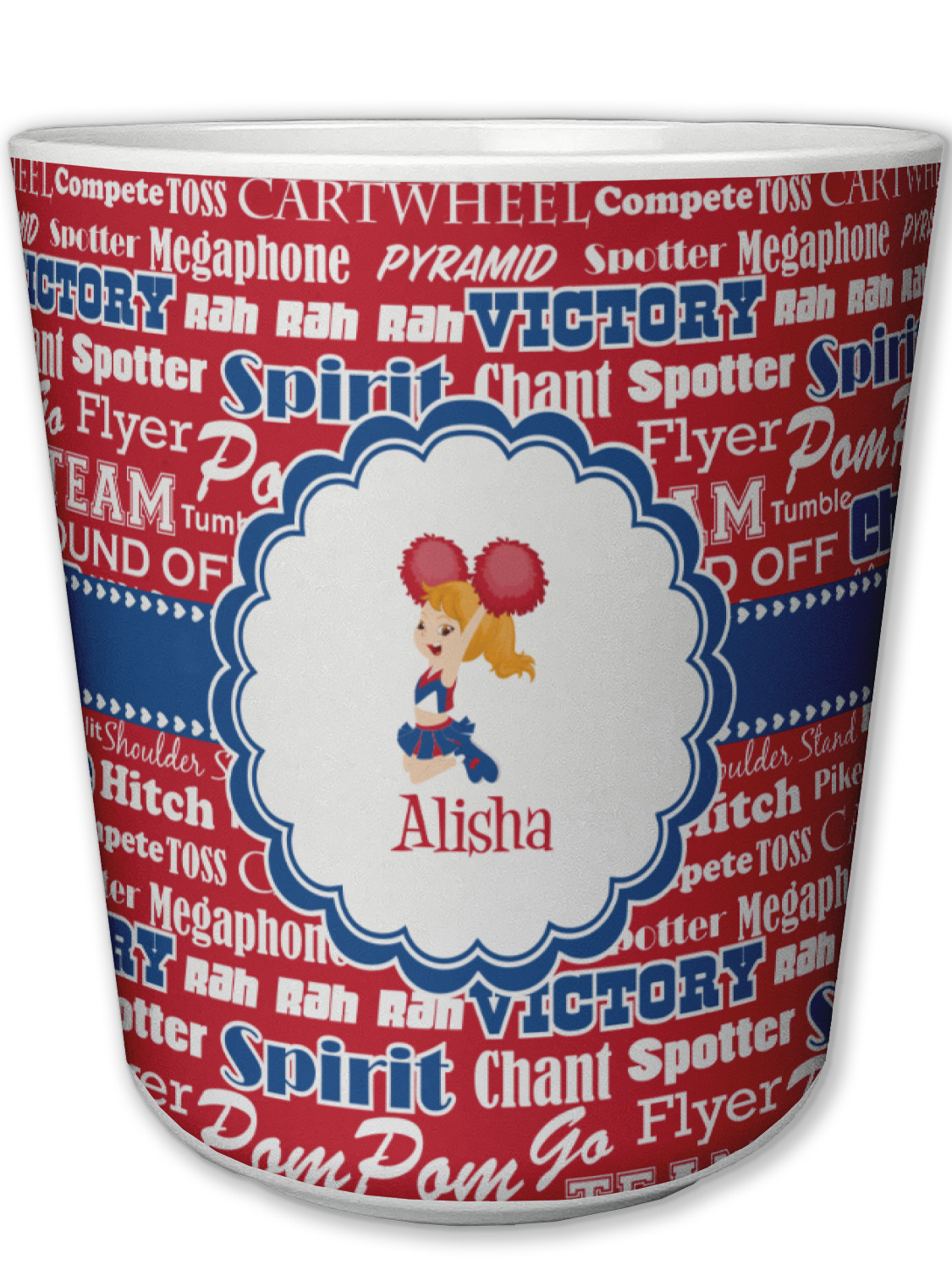 This design is perfect for cheerleaders. The background of the design is a word cloud of cheer words - words such as spirit, victory, team, cheer leader, pom pom and so many more. The background is fully re-color-able - so you can color it with your team's colors. We chose red, blue and white as those are our school's colors!