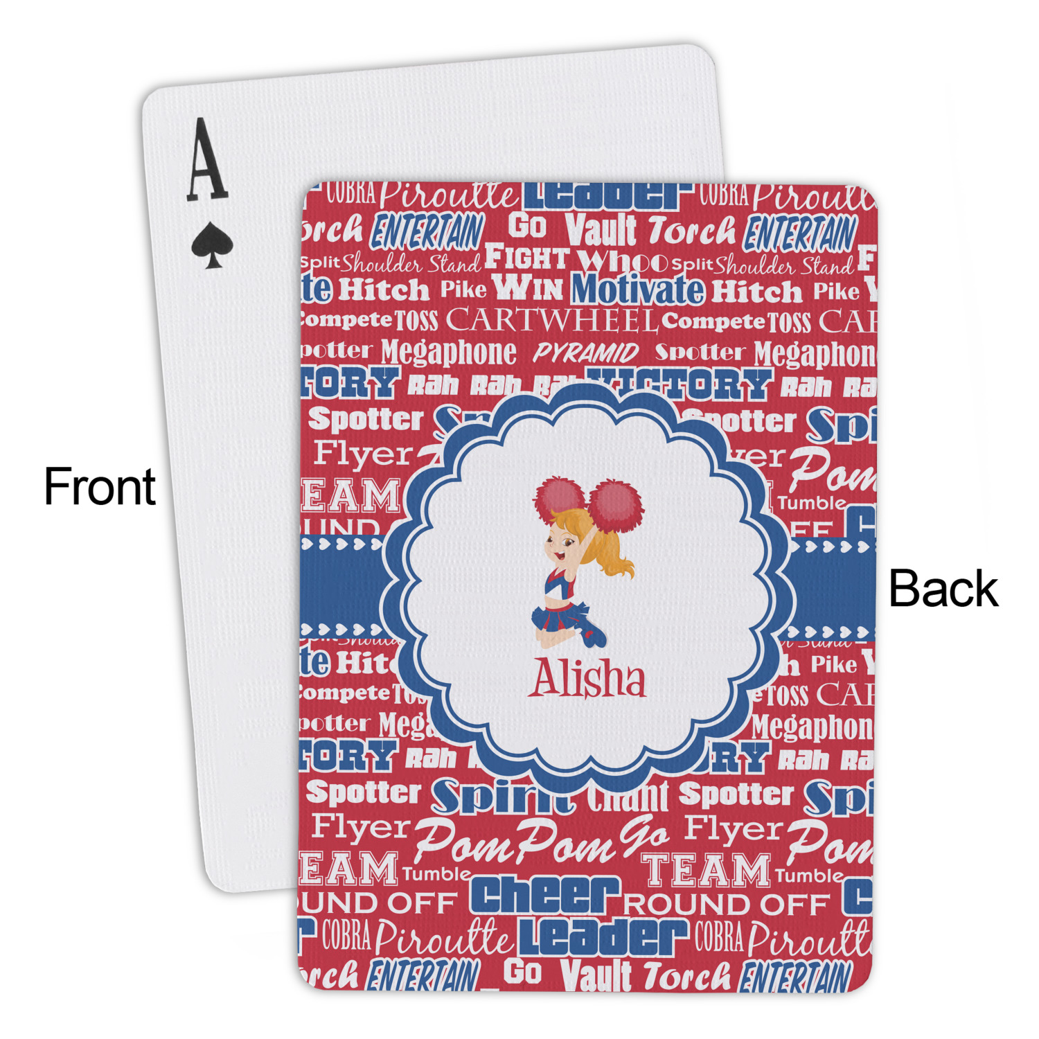 The customization / personalization is printed on the back side. The playing cards have a low gloss coating on both sides. The cards are packaged in a clear plastic box.