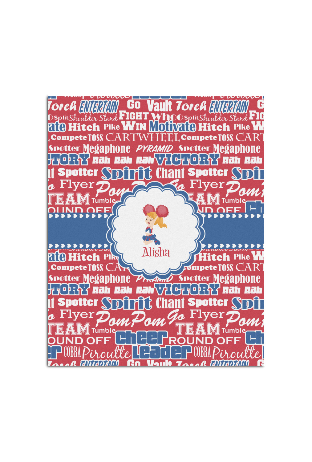 This design is perfect for cheerleaders. The background of the design is a word cloud of cheer words - words such as spirit, victory, team, cheer leader, pom pom and so many more. The background is fully re-color-able - so you can color it with your team's colors. We chose red, blue and white as those are our school's colors!